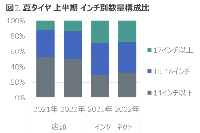 夏タイヤのサイズ構成をみると、店頭とインターネットで対照的な傾向がみられた。店頭では高インチの販売が拡大しており、17インチ以上の数量構成比は前年同期の12%から13%に拡大した(図2)。ただ店頭では14インチや15インチが引き続き主流であり、155/65/14では数量ベースで21%、195/65/15では7%を占めた。インターネットでは軽自動車に多く採用される14インチ以下が伸びており、2022年上半期の数量構成比は前年同期の29%から33%に拡大した。特に155/65/14の伸びは著しく、販売本数は前年同期の1.8倍に達した。