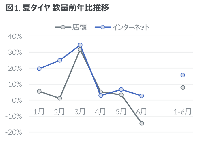 ・ タイヤは数量前年比14%増と好調で、平均価格は店頭、インターネットともに5%上昇した。