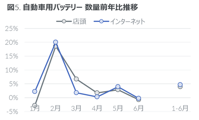 2022年上半期の数量前年比は4%増で、店頭では同4%増、インターネットでは同5%増であった(図5)。月別にみると、昨年より気温が低かった2月は店頭では数量前年比19%、インターネットでは同20%増と大幅に増加した。店頭ではハイブリッド車向け製品が好調で数量前年比26%増と大きく伸長したことで、店頭の平均価格は13,432円と3%上昇した。インターネットではアイドリングストップ車向け製品の価格上昇の影響が大きく、平均価格は9,550円と3%上昇した。結果、金額前年比は店頭では7%増、インターネットでは8%増と堅調であった。