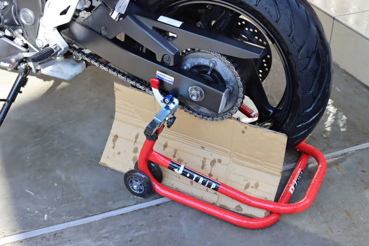 ガレージの床やバイクを汚したくないのであれば、落ちてきた汚れを受けるトレーや新聞紙や段ボールなどを用意すると良いだろう。