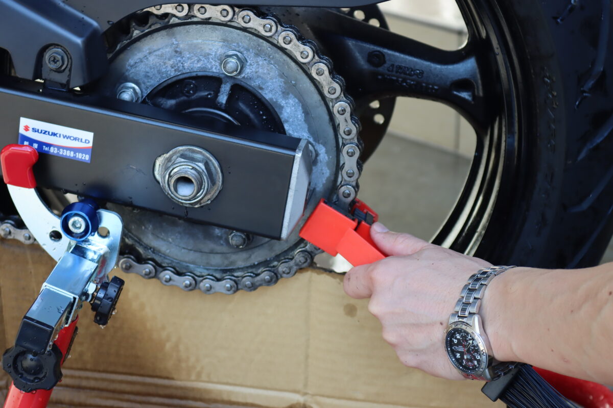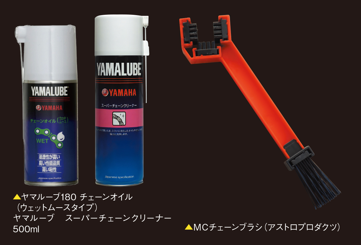 そしてメンテを行う場合に用意しなければならないのはバイク専用のチェーンクリーナーとチェーンオイル。他にブラシと汚れを拭き取るウエスなど。