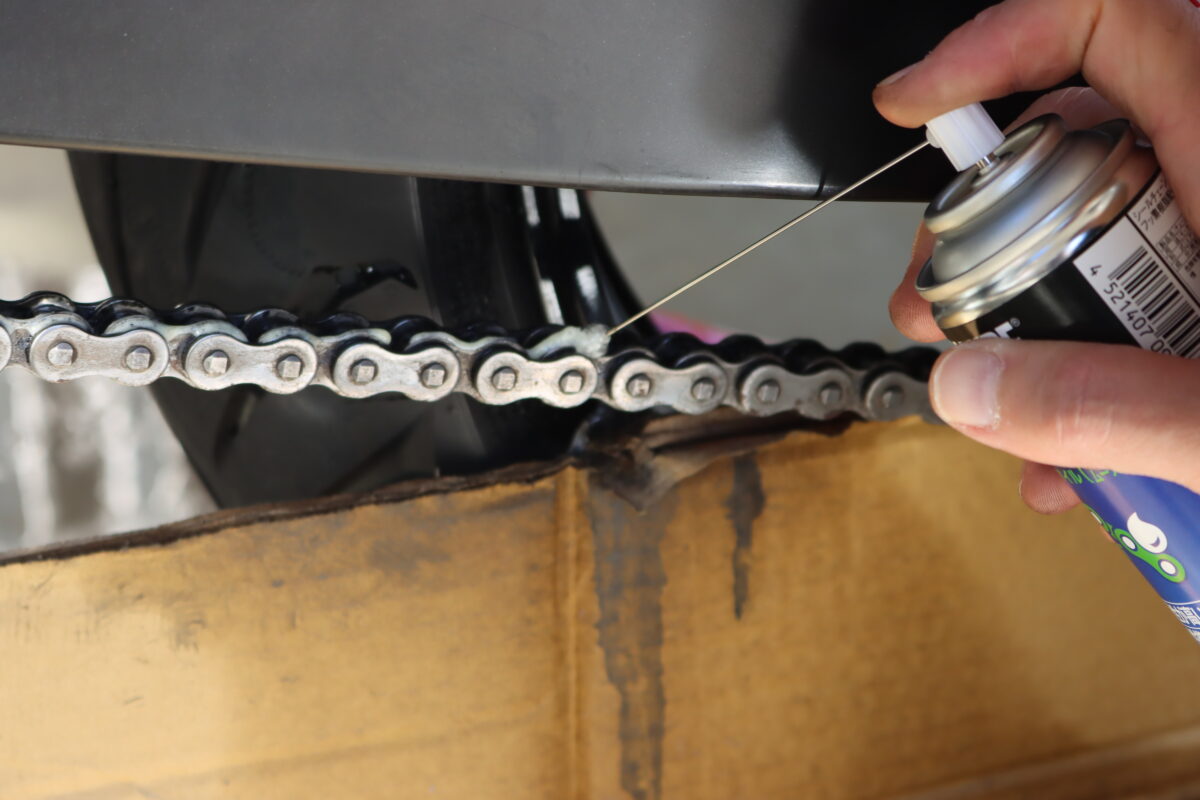 まずはチェーンクリーナーを使用して汚れを落とす。まんべんなく吹き付けるようにしよう。
