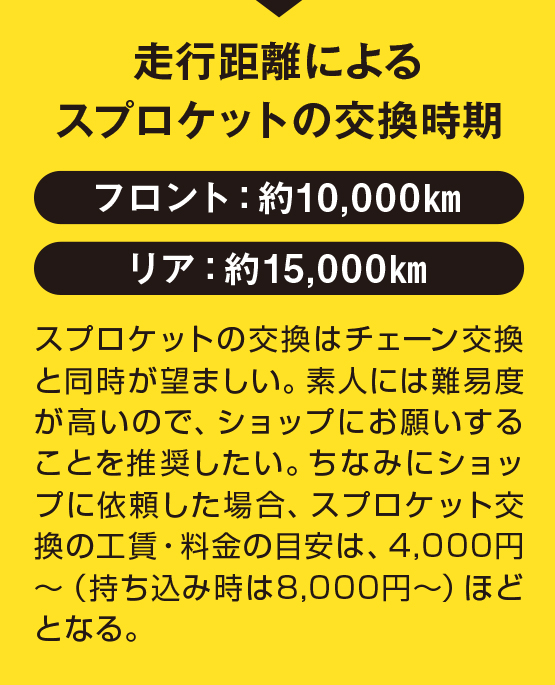 作業はチェーンのメンテの際に併せて行うようにしよう。手順としては、チェーンにクリーナーをスプレーして、チェーンでスプロケを綺麗にする。大きな汚れや絡まったゴミなどは、歯ブラシを使って取り除く。スプロケのケースもウエスで拭いて綺麗にする。洗浄が終わったら、元通りにカバーをつけてスプロケのメンテは完了。チェーンメンテほどまめにする必要はないが、2回に1回程度はカバーを外して、スプロケのメンテナンスをしよう。