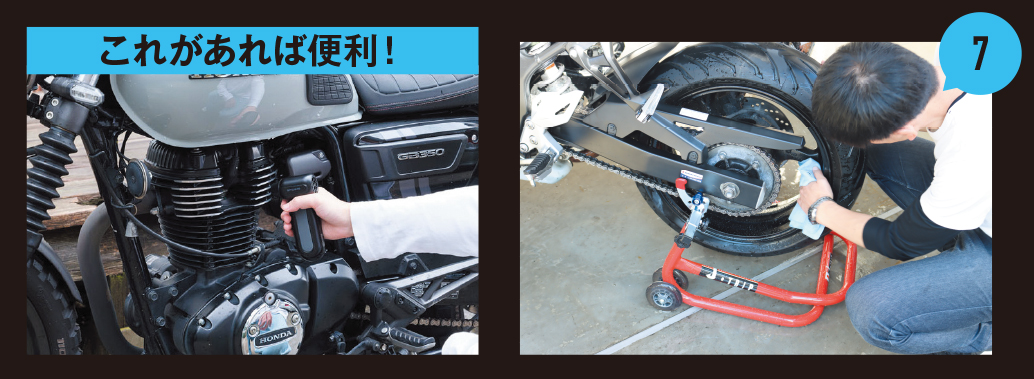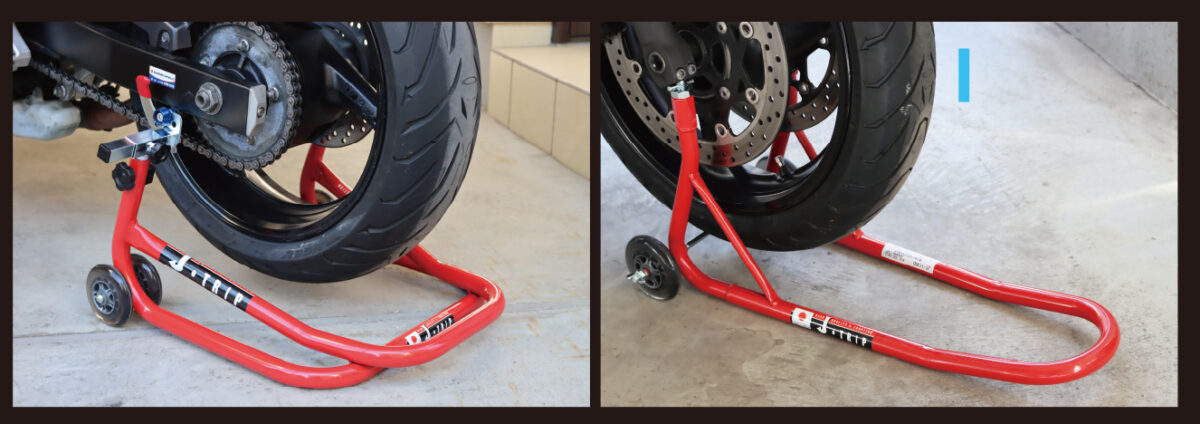 センタースタンドが備わっている車種は必要ないが、そうでない車種はメンテナンススタンドを使用すれば便利かつスピーディーに作業をすることができる。