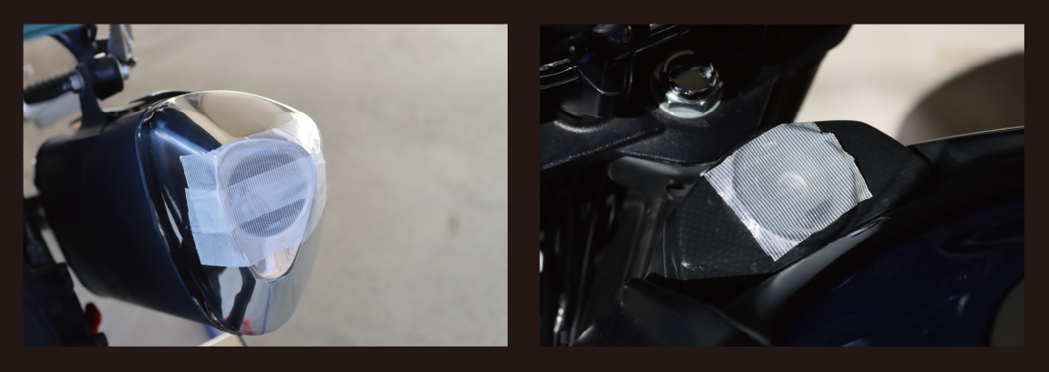 ホースの水をかける前にキーシリンダーやマフラーの出口を養生テープなどで塞いでおこう。水が入ると錆びたり不具合が出てしまう可能性があるからだ。