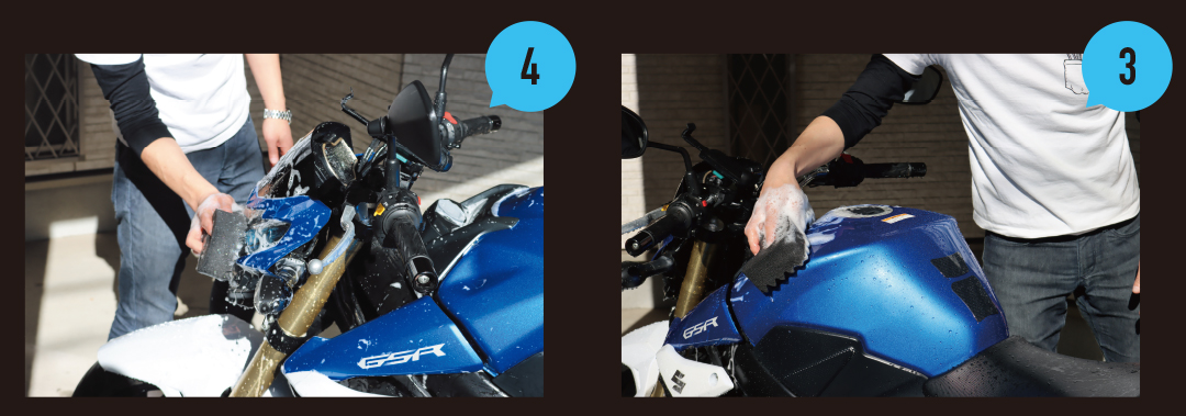 基本的に水をかける方向はバイクが走るときを意識して、前&上からであれば安心だ。