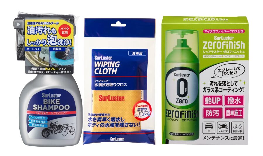 弱アルカリ性で、汚れをしっかりと分解するバイクシャンプーや、高い吸水性を誇るクロス、クリーニングとコーティングを一緒にできるアイテムもラインナップしている。(販売:シュアラスター)