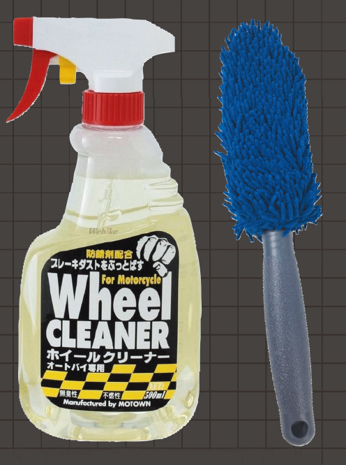 ホイールはチェーンオイルに泥汚れなどがこびり付き、汚れやすい箇所の一つ。専用のブラシやクリーナーを使えば効率的にキレイになる。(ホイールクリーナー/販売:モータウン)