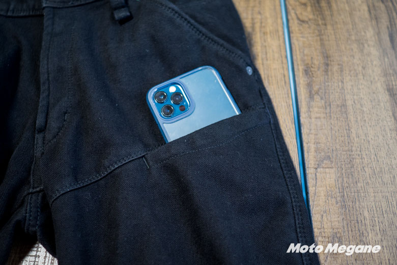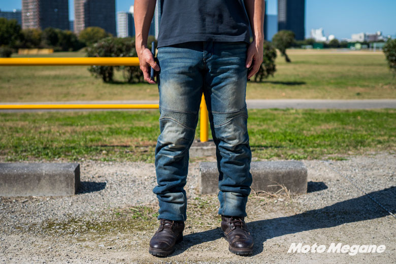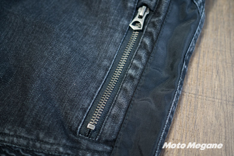 最大の特徴はCODURAナイロンを使用したストレッチデニムに、ナイロンオックスを重ねて強度をあげているところ。生地は120%ストレッチするうえに膝部分は蛇腹になっているので動きを妨げることがない。