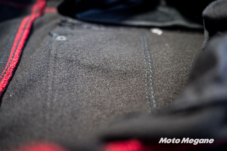 表地には耐久撥水処理がされており、水をはじくことができるが、経験上過信はできない。小雨程度であれば問題ないが雨天時の走行では簡単に浸水する。あくまで「撥水」なので注意が必要だ。