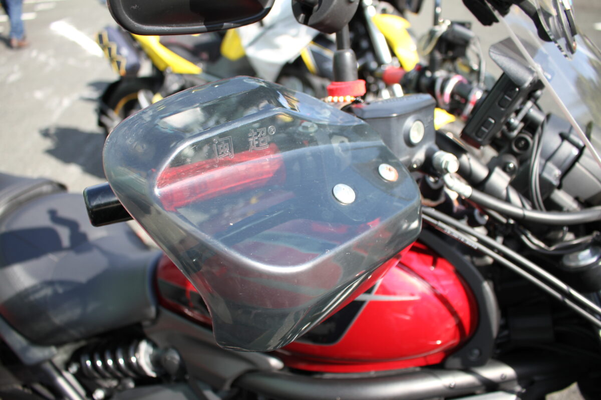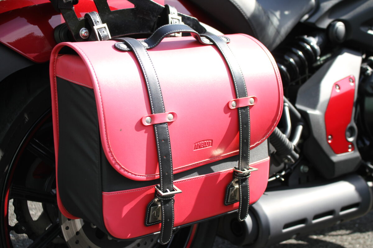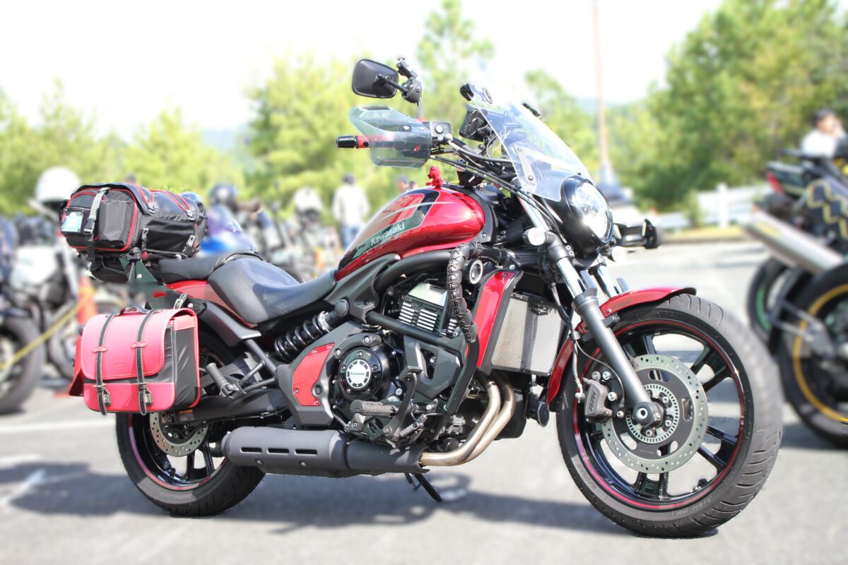 真っ赤なサイドバッグは大久保製作所「AMBOOT」。東京モーターサイクルショーで新製品として展示されている製品を見かけて「バルカンに似合う!」と発売と同時に購入。とても気に入っています♪