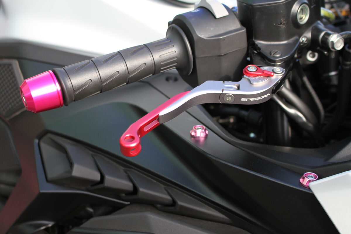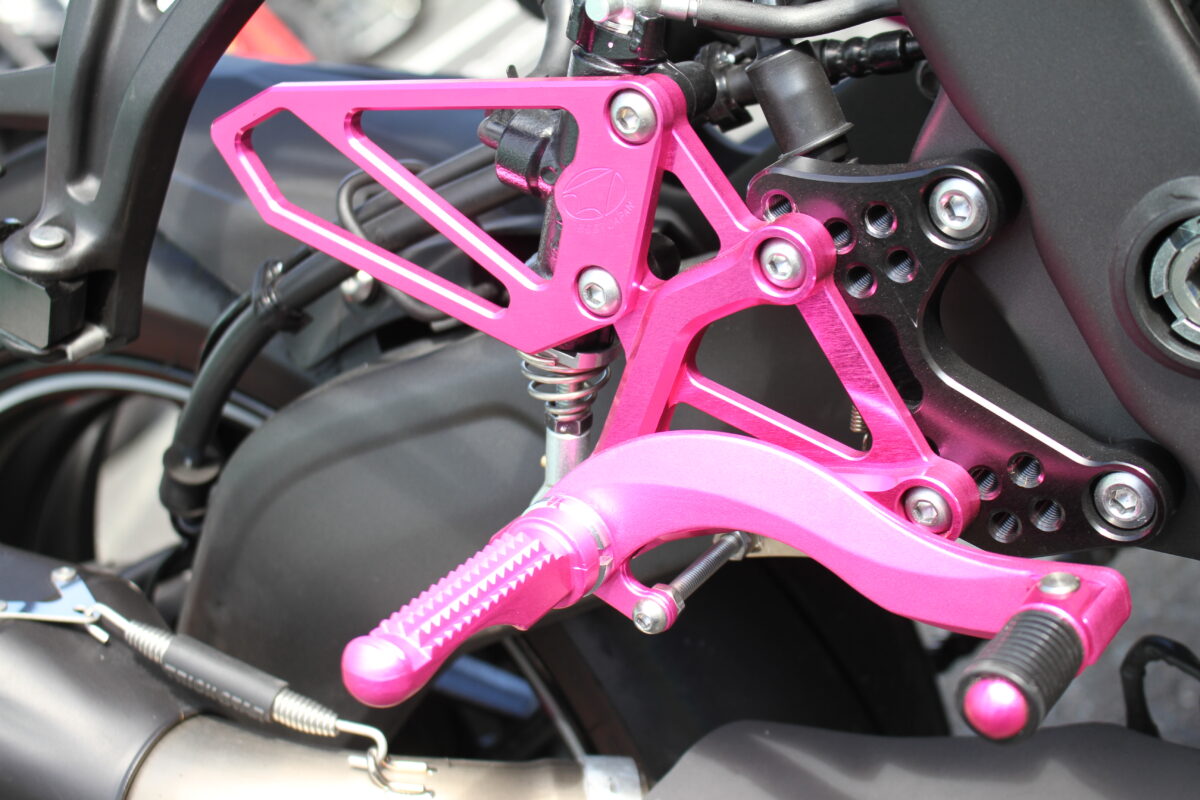 1番のカスタムは、バックステップをBEETでピンクにカラーオーダーした点です。それ以来、イベントでピンクのカスタムパーツを見つけては購入しています。ポッシュフェイスのバーエンド、リヤブレーキのマスターキャップ、タイヤのエアバルブキャップ、メンテナンスフックなど)。
