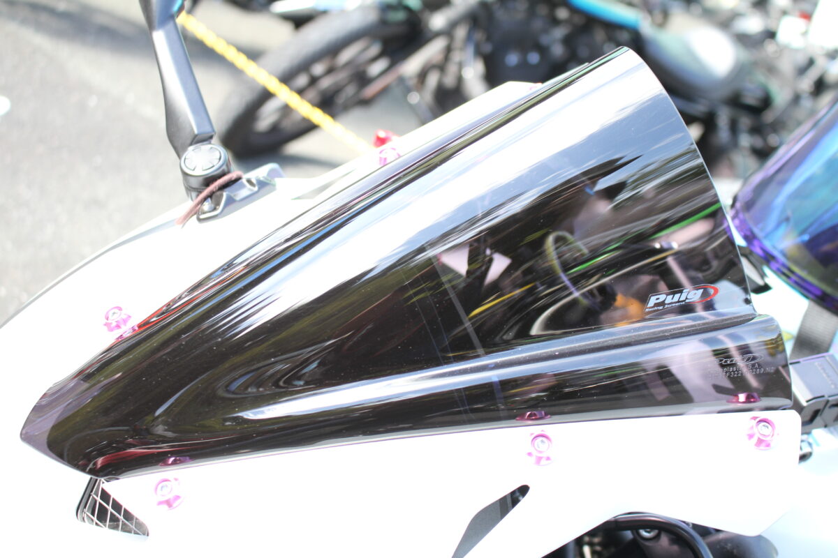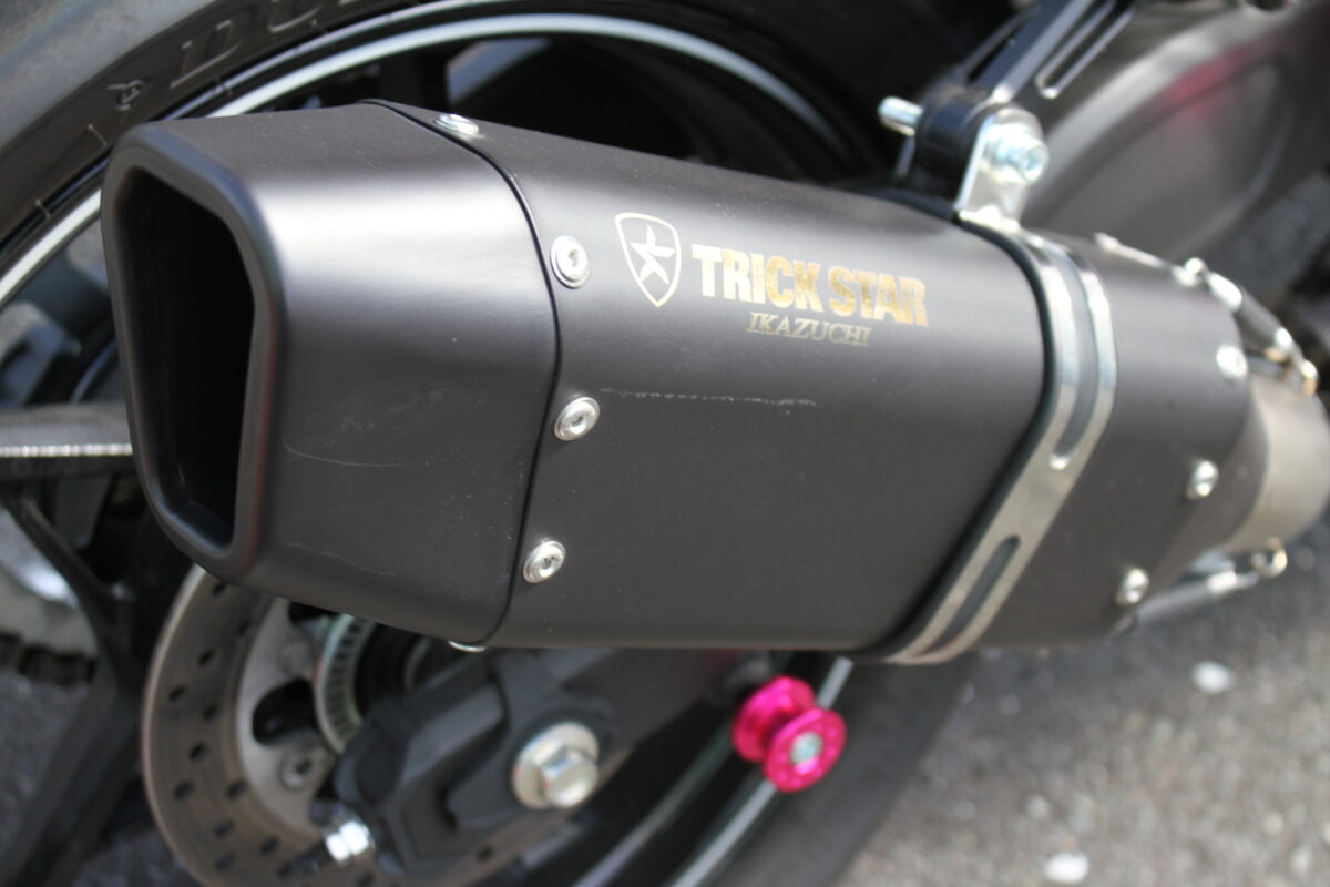Puig(プーチ)のスクリーン、トリックスターのマフラーに交換し、タイヤはダンロップQ5sにしています。スタンド停車時に4Rは思いのほか車体が傾いて起こすのが大変だったので、BEETのサイドスタンドプレートを付けました。