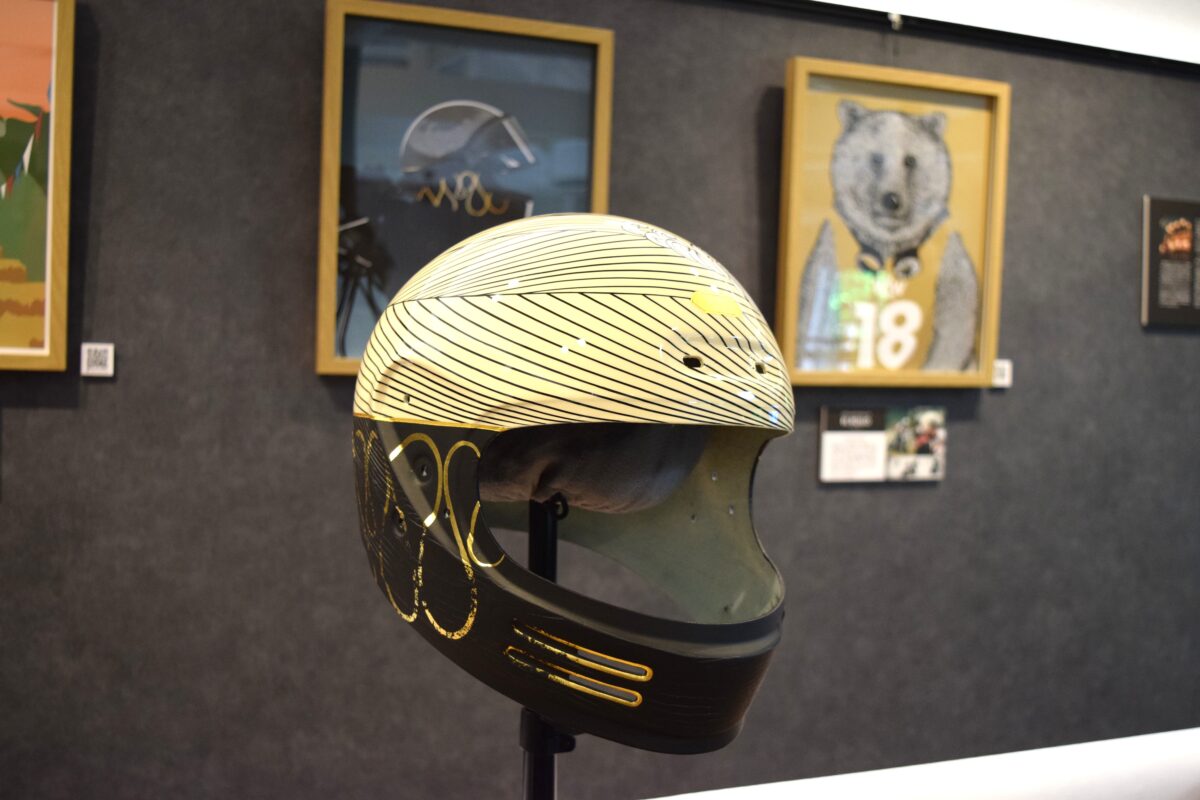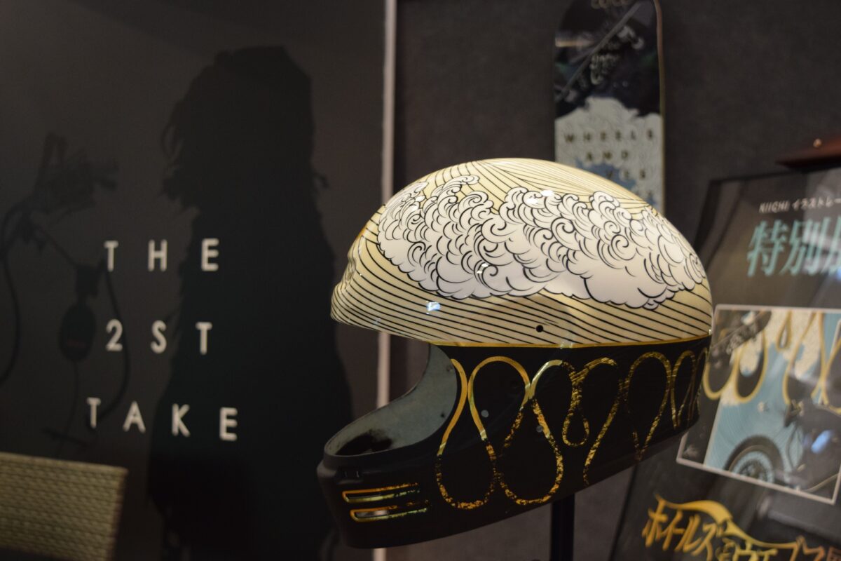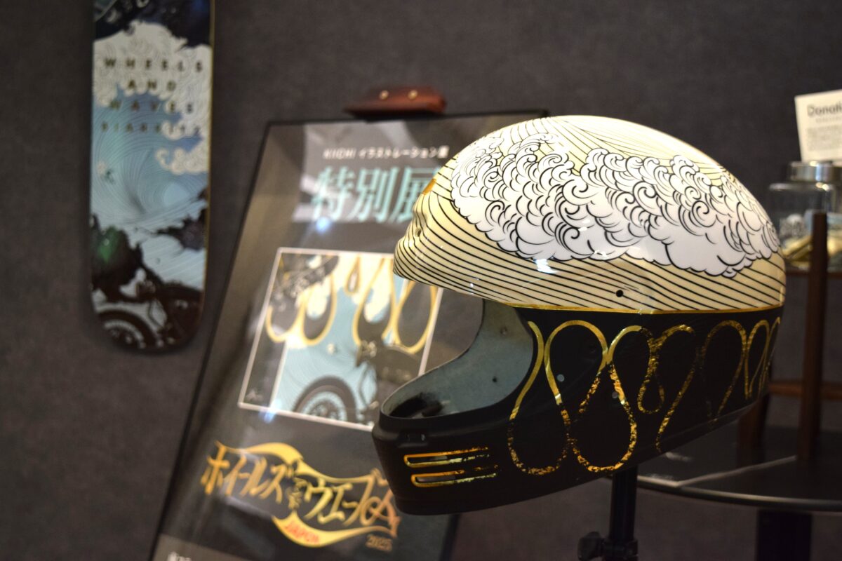 更に目を惹いたのはポツンと一つ展示されたヘルメット。これは、本国のフランスでWheels and Waves開催時に展示するものだそうで、メインビジュアルのデザインをヘルメットに落とし込んだものだ。