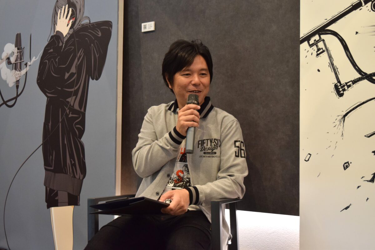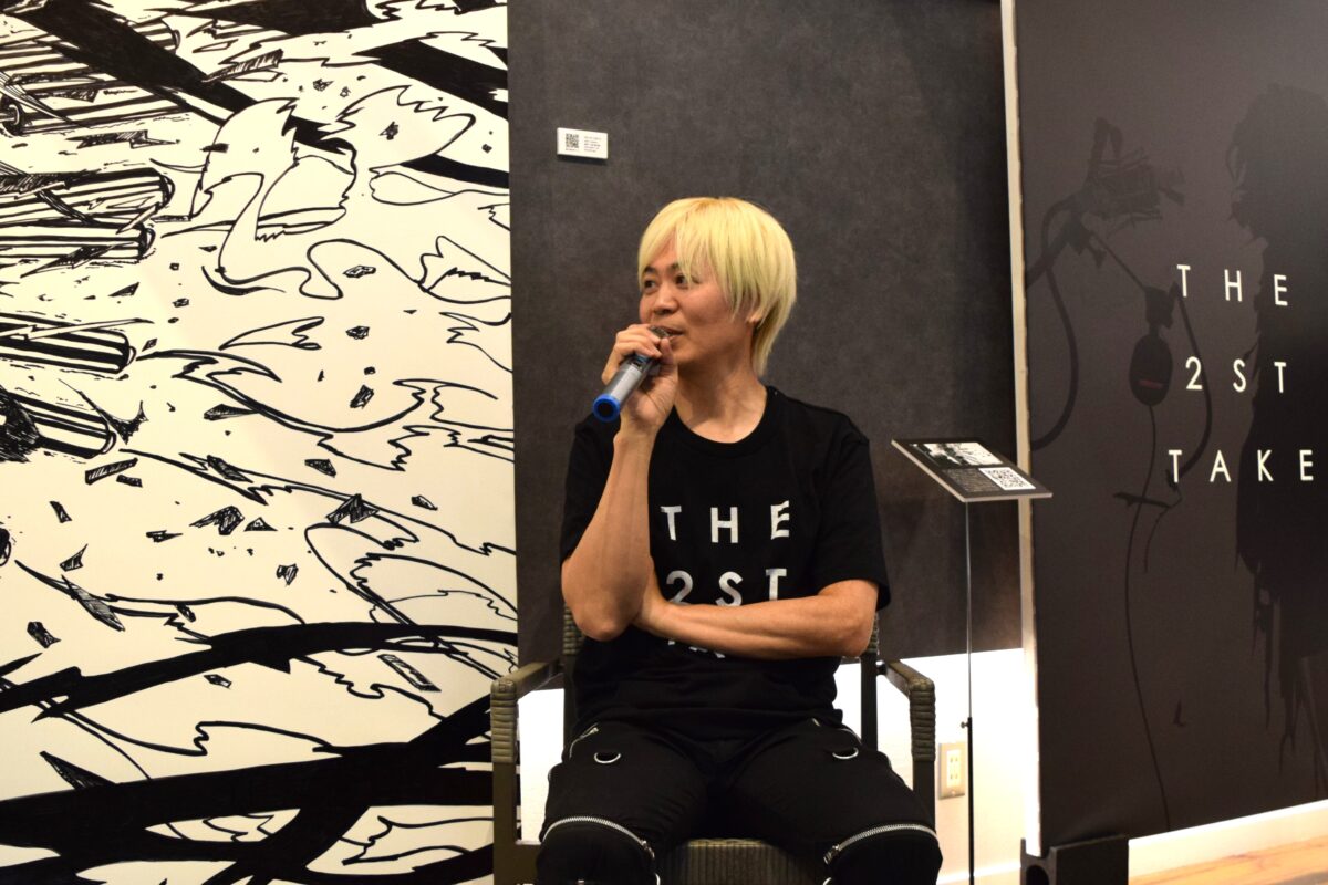 KIICHI氏からは今回のイベント並びに作品についてが語られた。“THE 2ST TAKE”の作品は3つで1つ。昔のバイクレースで使用されていた2ストエンジンは1レース使い捨てで、1レースのために生まれて死んでいくようなものだった。そんな2ストエンジンの一生を、今人気のYouTubeチャンネル“THE FAST TAKE”でマイク1本で1歌唱に全力をかける女性歌手の姿に重ねて表現をしたのがこの“THE 2ST TAKE”とのこと。更に向こうがマイク1本ならこちらはペン1本で勝負!となったそうだ。