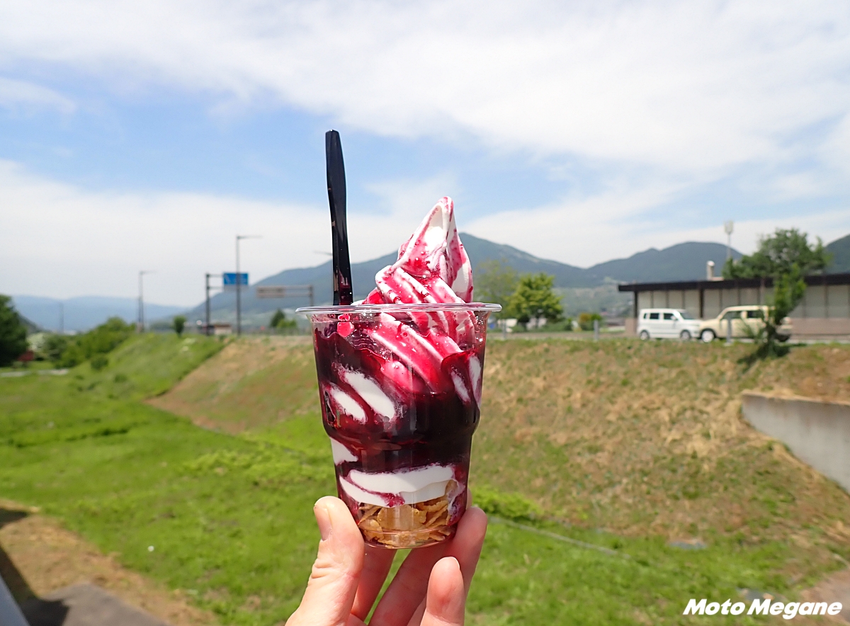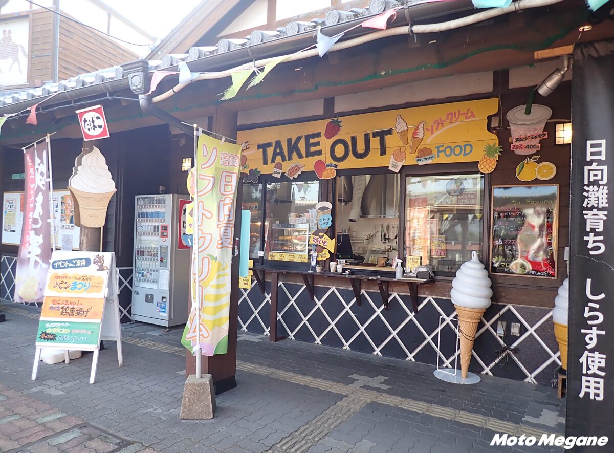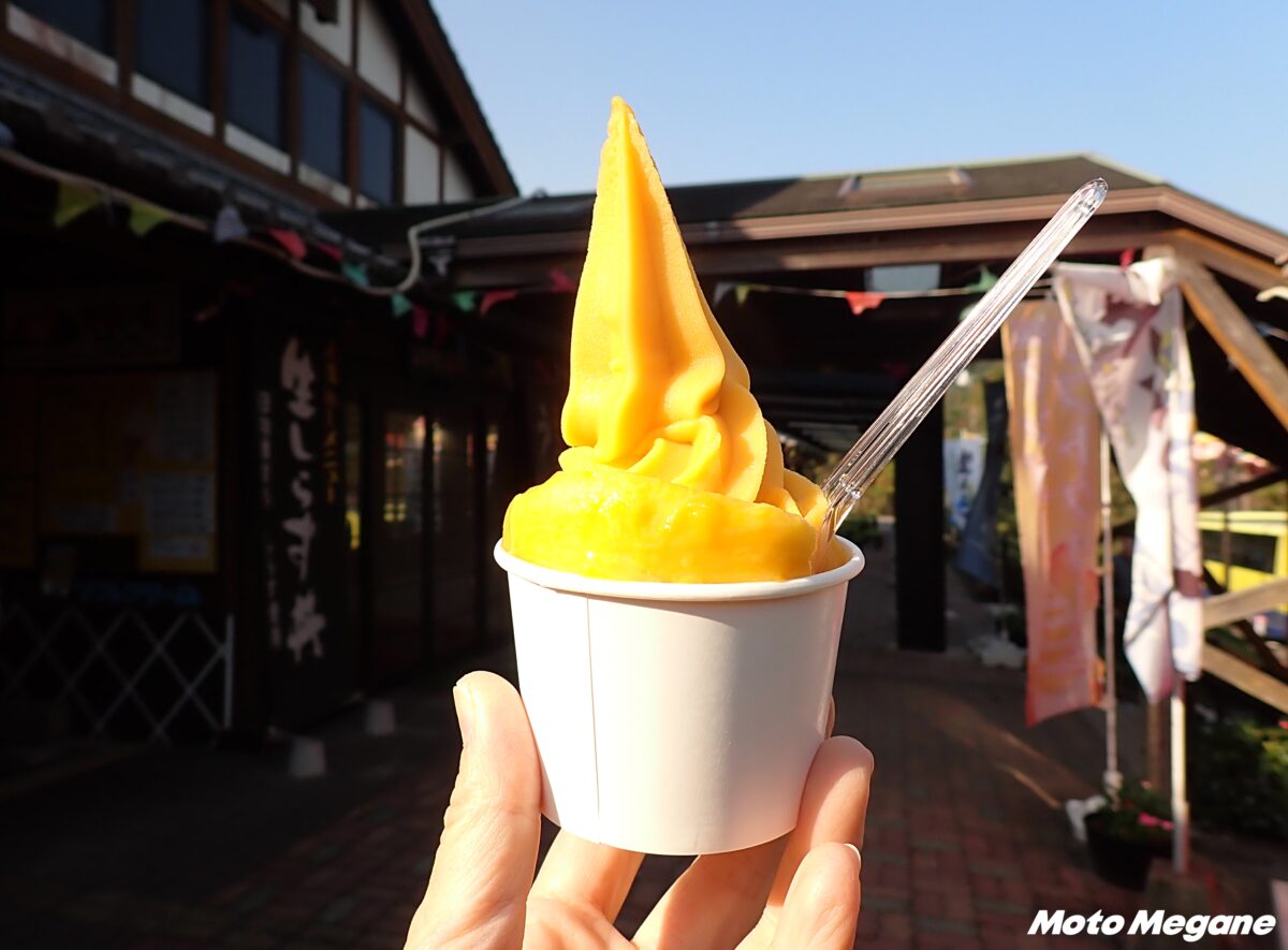 「道の駅 北川はゆま」がある宮崎県延岡市のR399は、海側は日向灘に、陸側は山に囲まれた自然豊かな地域でツーリング、ドライブに最適。夏グルメの定番は、宮崎産マンゴーを使用したソフトクリームで、超濃厚マンゴーソフトに、さらにマンゴー果肉がトッピングされた贅沢な一品だ。