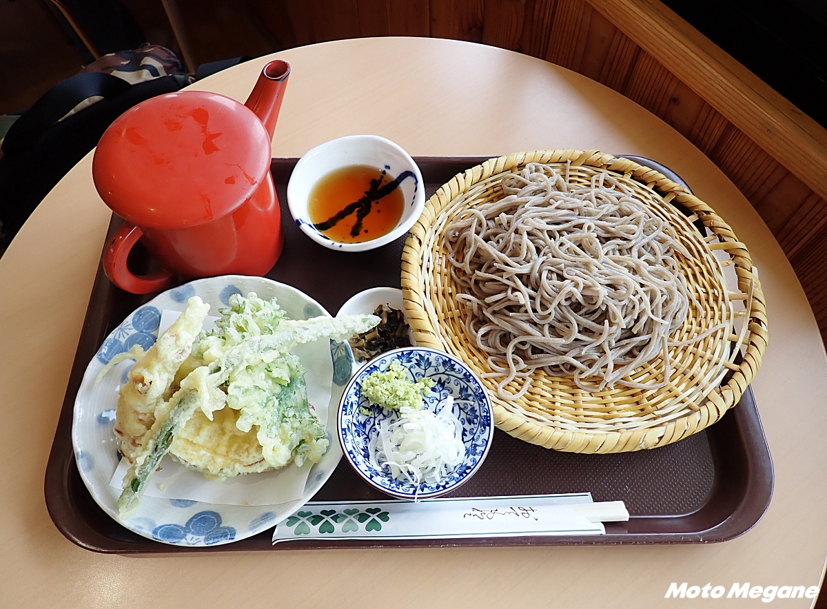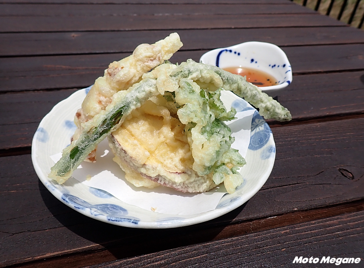 「道の駅 北信州やまのうち」は、志賀高原や湯田中渋温泉郷といった観光地を有する自然豊かな町にある。 夏グルメのオススメは、地元産のそば粉を使ったそば。1番人気は天ざるで、地元産の季節の野菜の天ぷらがついてくる。天ぷらは、春は山菜、初夏にはアスパラと、季節ごとに山の味覚を楽しめるのが魅力だ。