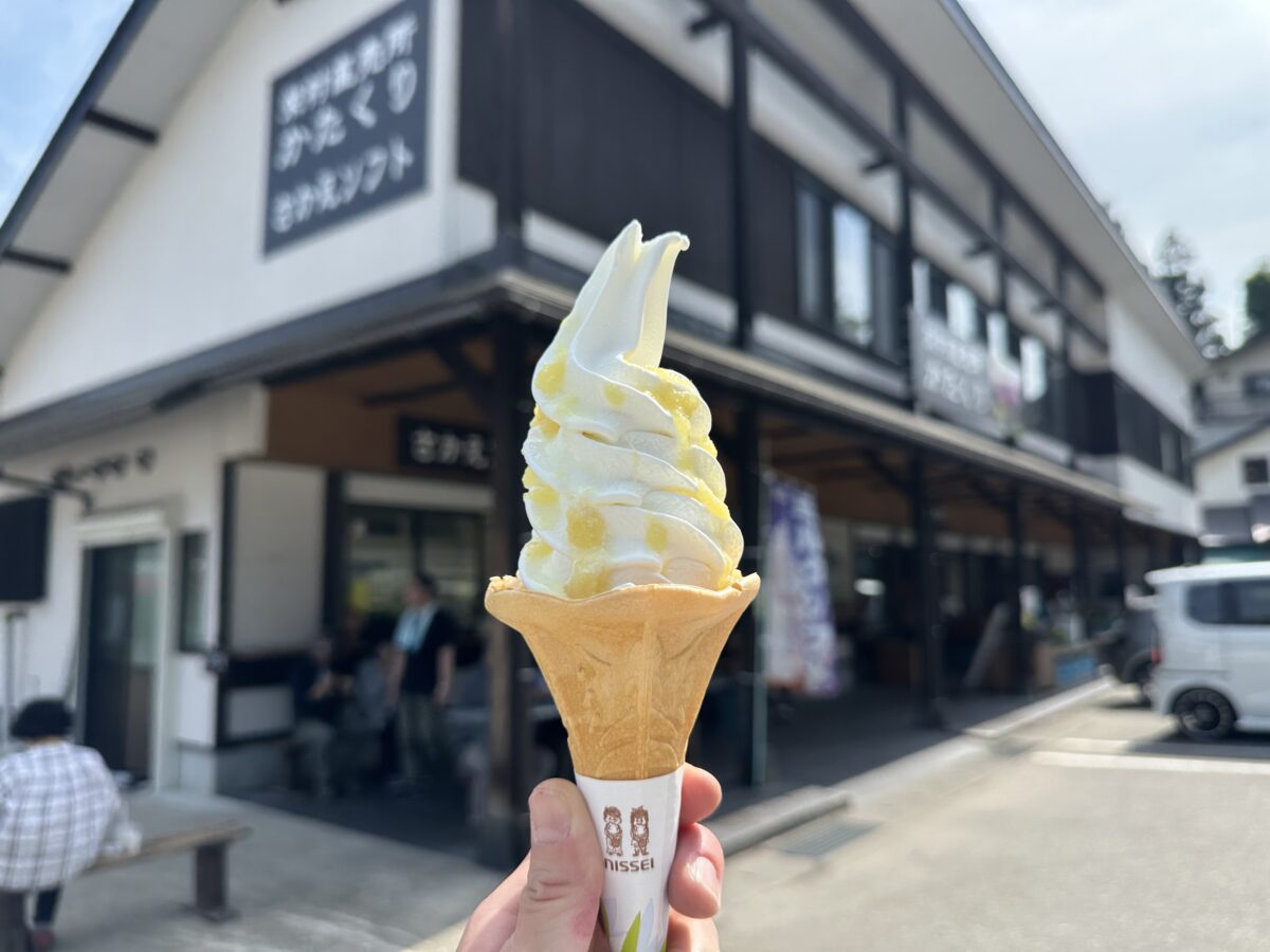 オリジナルのソフトクリームでクールダウンし、木々の間をJR飯山線のディーゼルが抜ける情景を眺めれば、ひと息つける高原の休憩地だ。アクセスは豊田飯山ICや塩沢石打IC方面から良好で、周辺の渓谷や温泉めぐりと組み合わせた周遊もオススメだ。