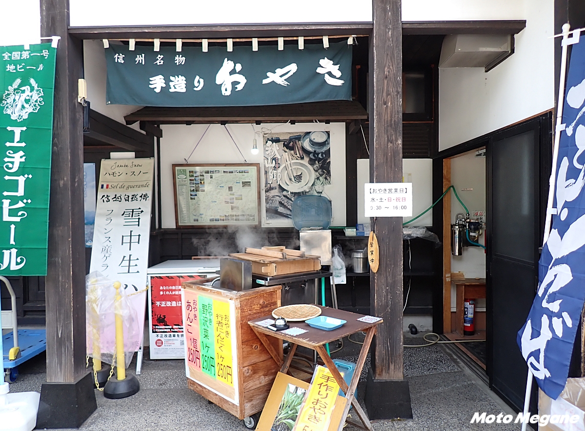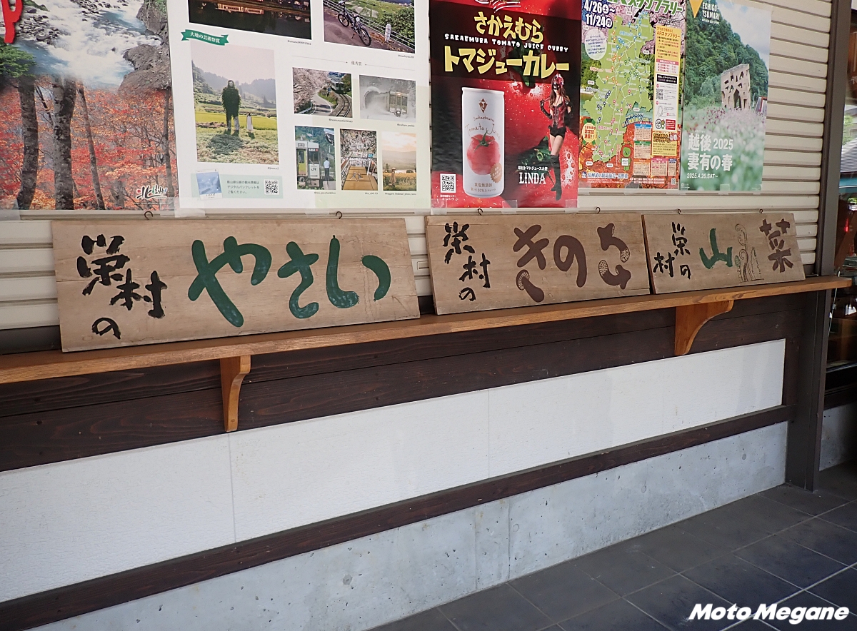 R117沿いの山あいにある「信越さかえ」は、裏手を流れる千曲川の風が心地よく、体をやさしく冷ましてくれる道の駅だ。物産館にはトマトジュースやおやき、地元産そば粉の手打ちそばなどが並び、屋外スタンドでは週末を中心に湯気立つ麺や蒸したてのおやきを楽しめる。売り場には秋のきのこも出始めるため、季節の移ろいを舌で感じられる。