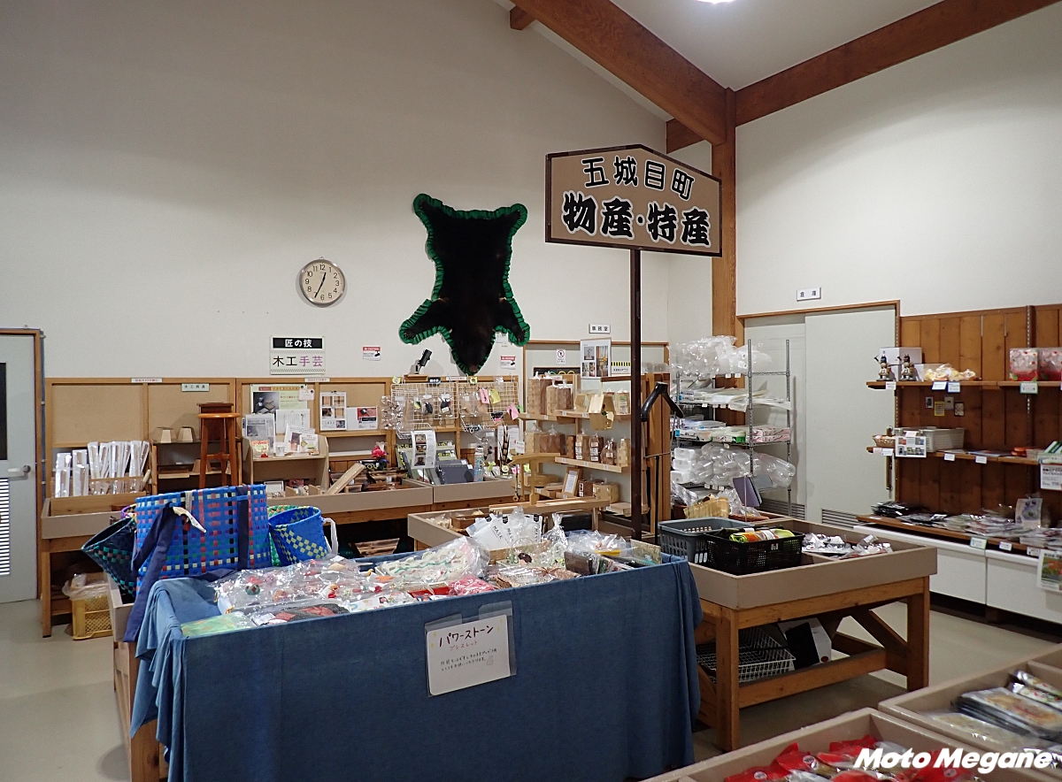 物産館には地場産の新鮮な農産物、加工品、キイチゴの菓子類やおやき、木工品、秋田の土産品などが並ぶ。さらに五城目町にある福禄寿酒造の日本酒や県内日本酒など、お酒も豊富に取り揃えられている。クマの爪や手のキーホルダーなど、マタギの文化が残る地らしい民芸品も揃っていた。