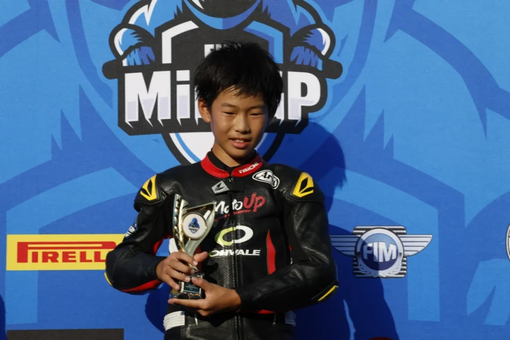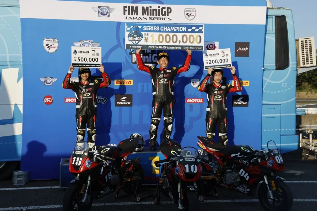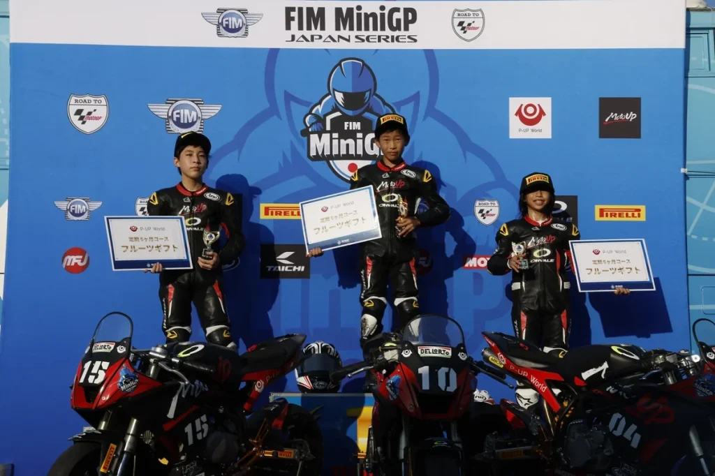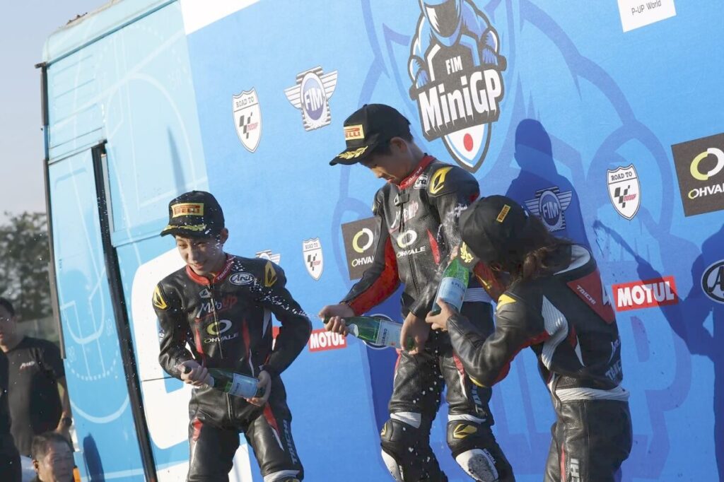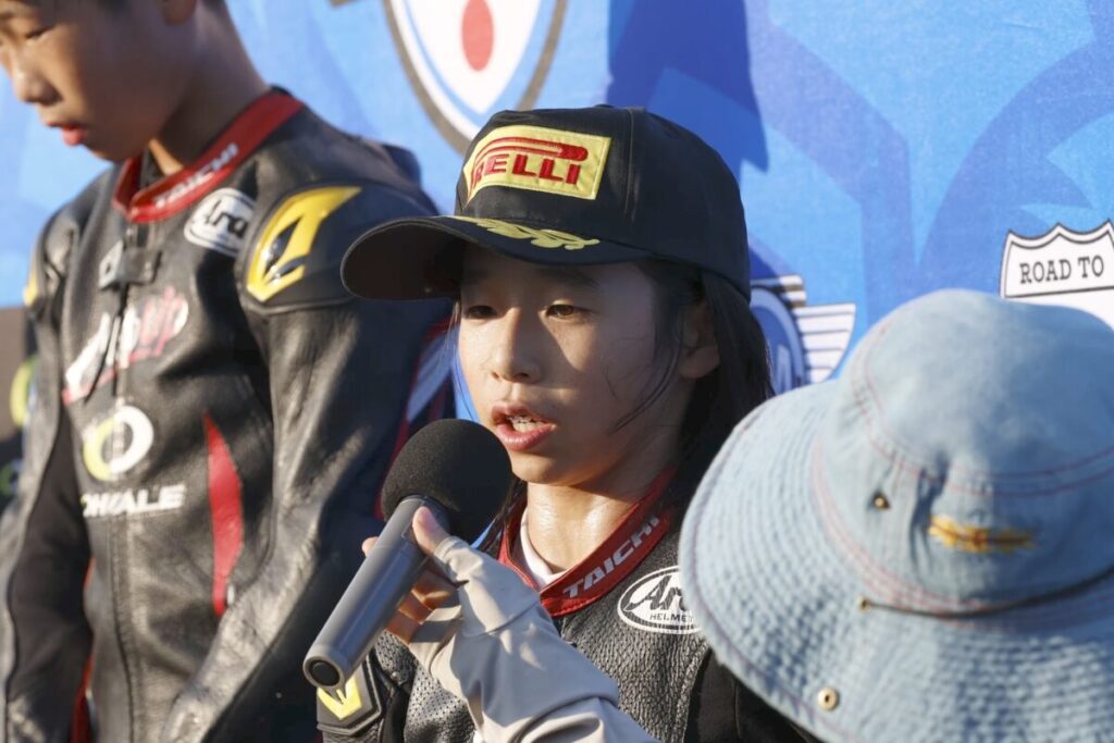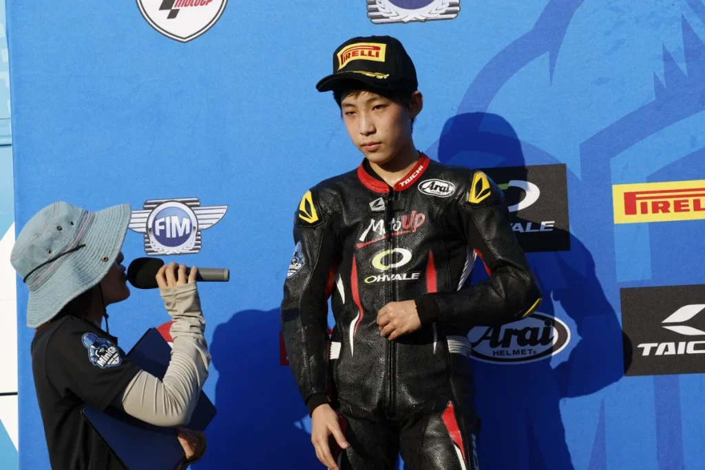 「桶川は、あまり練習する機会もなくタイムも出しにくい状態でしたがアドバイザーの皆さんのアドバイスのおかげで、レースまでにいろいろなことを改善することができました。レースはトップ争いについていけなかったことは悔しいですが、知識隼和選手とのバトルを制して両レースとも3位に入れたのは、よかったと思います。シリーズランキング2位になることができたので、11月のワールドシリーズに向けてトレーニングや体調管理も行い優勝できるように精一杯頑張ります。MotoGPで世界一になるという夢に少しでも近づきたいですね」。