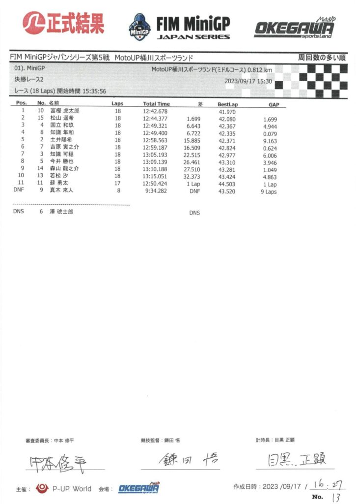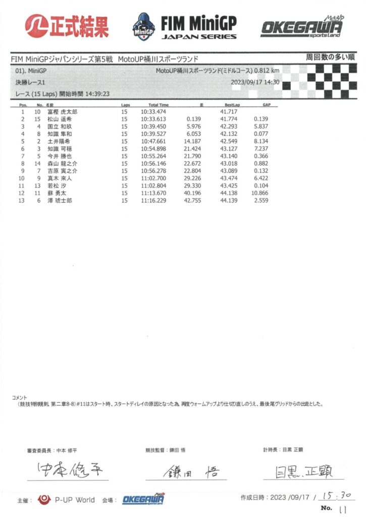 プレッシャーから解放された #10富樫 は、ストロングポイントである3コーナーのブレーキングで #04国立 をかわしてトップに立つとペースを上げ2番手以下を引き離していく。これを追いたい #15松山 だったが、4番手とやや出遅れ、3周目に #08知識隼和 を、5周目に #04国立 をかわし2番手に上がるが、この時点でトップの #10富樫 とは差がついてしまっていた。逃げる #10富樫、追う #15松山。その差は縮まらず #10富樫 がトップでゴール。今シーズン4度目のダブルウインを達成した。#15松山 は1秒699差の2位。3位争いは、またも #04国立 と #08知識隼和 の一騎打ちとなったが、#04国立 が #08知識隼和 に0秒079差で3位となった。5位に #02土井、6位に #07吉原、7位に #03知識可穏、8位に #05今井勝也、9位に #14森山龍之介、10位に #13若松汐、11位に #11蘇勇太 と続き、2023年のMiniGPジャパンシリーズを締めくくった。