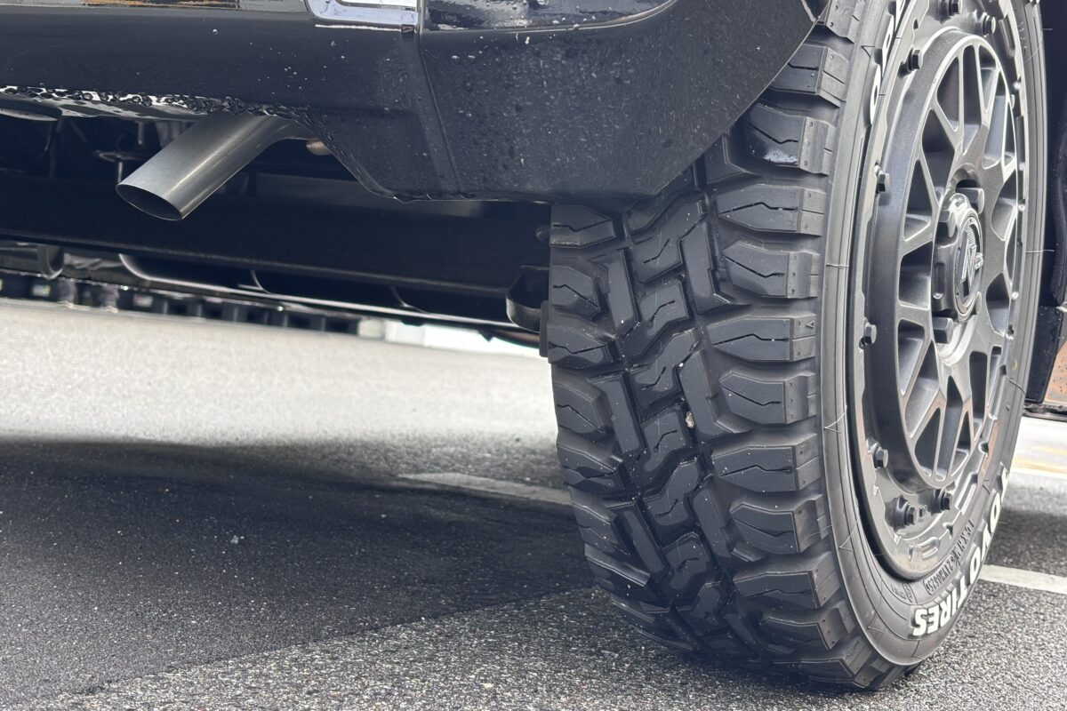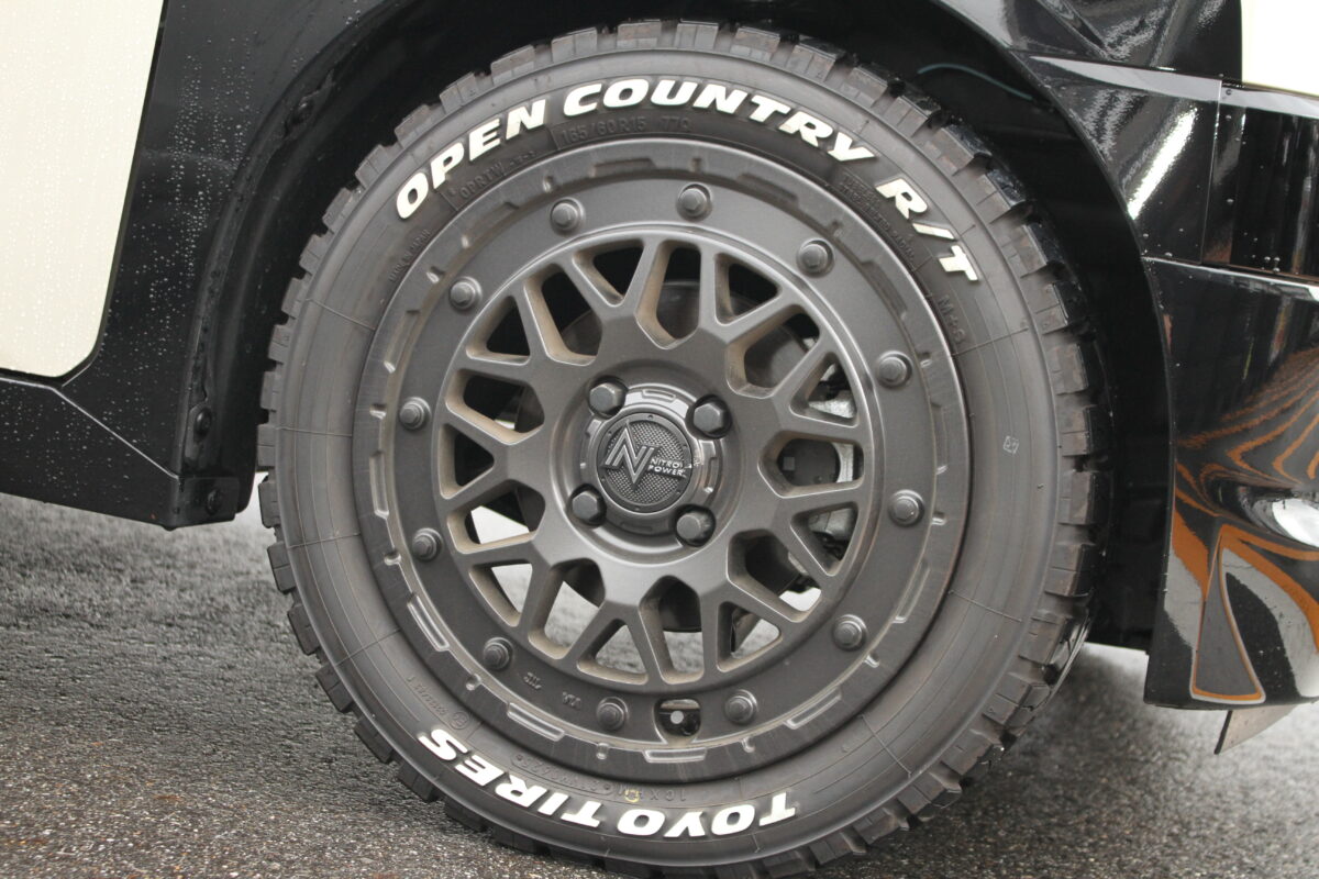 「デザイン・カラーが車両にマッチするかどうかですね。この車両はノーマルと同じ15インチのMID NITRO POWERに変更し、高扁平のオフタイヤを履かせて外径を大きくしています。