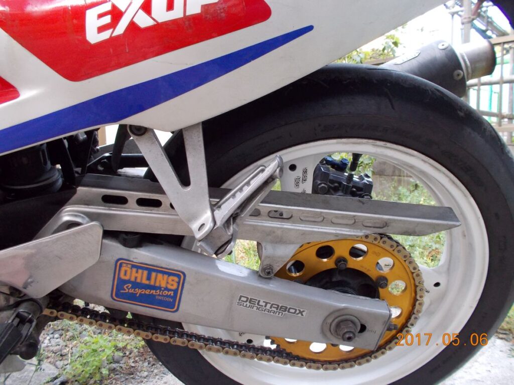 純正でアルミデルタボックスフレーム、アルミデルタボックススイングアーム、、FAI、EXUP、ピストンクーラ、アケボノ製異径4ポットキャリパーダブル、大径ダブルディスク、リアのマスターシリンダーがノーマルでブレンボ(ヤマンボとも言う)という豪華装備。