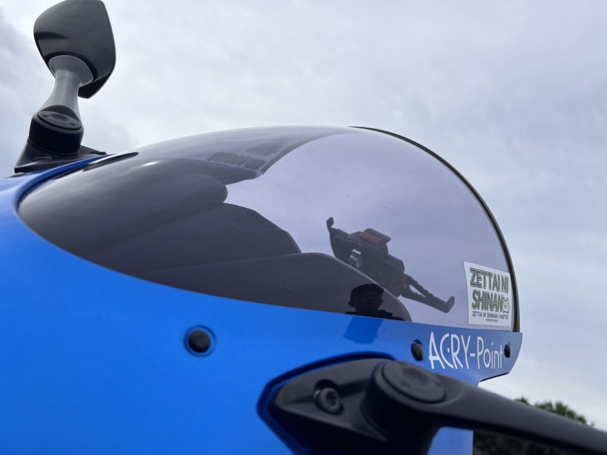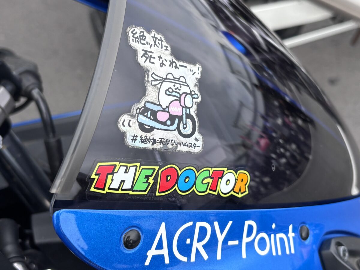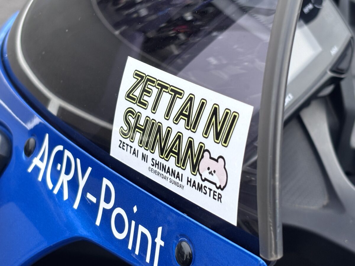 購入後に自分で交換した部品はアクリポイント製のスクリーン。防風性能は確実に上乗せできてると思います。交換後は体に受ける風圧が同じくらいなのに、速度は10km/h違っていました。あとはお守り代わりに貼っている「絶対に死なないハムスター」というキャラクターのステッカーは友人に配ったりしています。