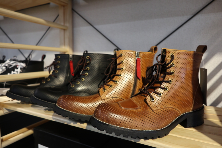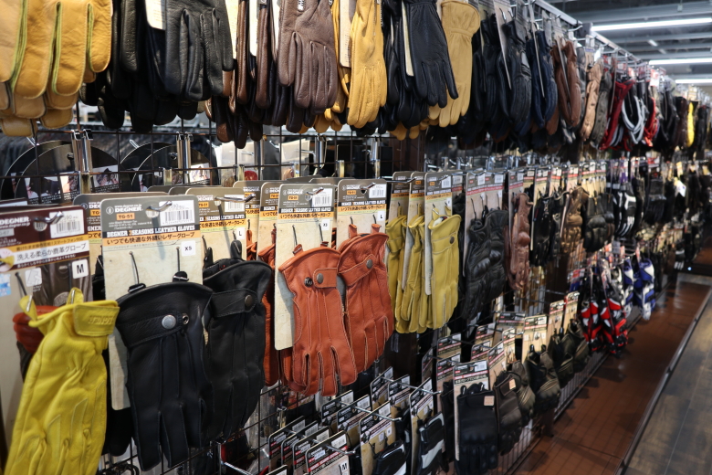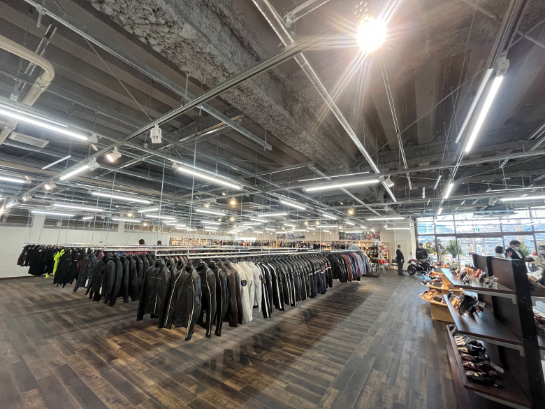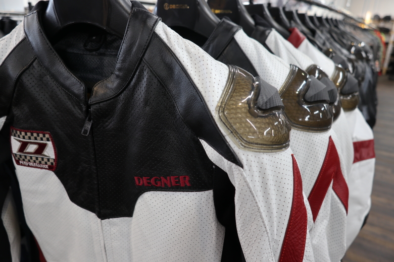 広い店内には約3000点もの同社の商品が並び、レザー&テキスタイルジャケットやTシャツ、パーカーなどのウエアに至っては500着〜600着も展示販売されています。一般的な二輪用品店だと販売スペースが限られる関係から、季節に応じて店頭に並ぶ商品が入れ替わってしまいます。しかし、この『デグナー八王子店』は季節に関わらず常に全ての商品を手にとってみられるのが大きな魅力! シーズンに先立っていち早くアイテムを入手できるのです。