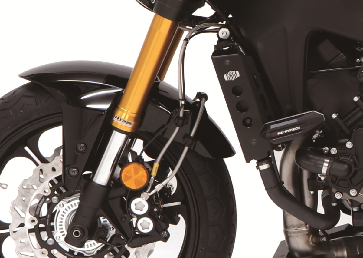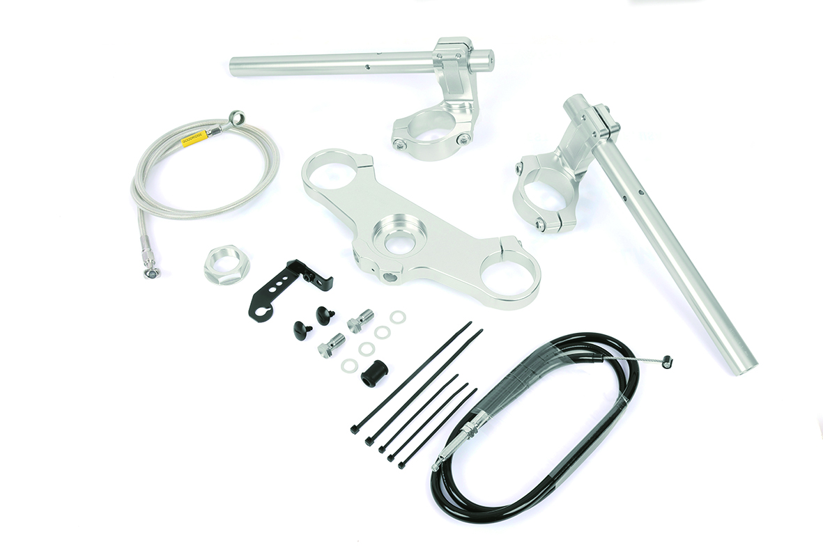 純正のバーハンドルからセパレートハンドルに変更できるキット。前傾姿勢になりすぎず乗りやすいポジションに設定。フロントマスター~ABSユニット間のブレーキホースなど取り付けに必要なホース類が付属。