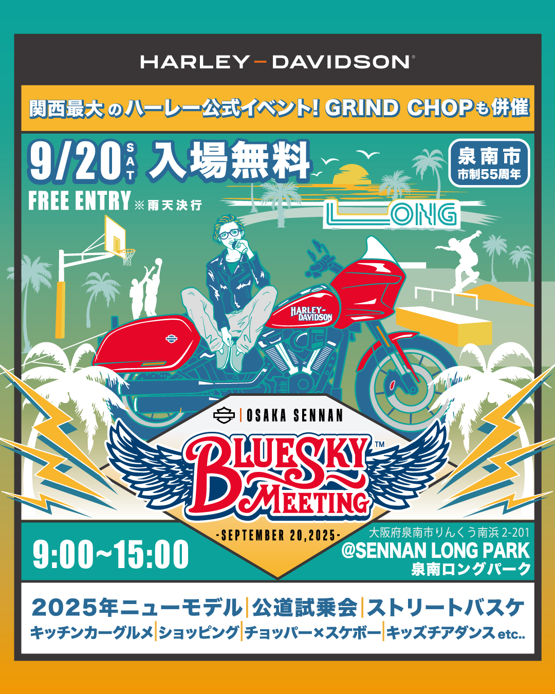 ハーレーダビッドソン ジャパン株式会社は、カルチャーイベント『BLUE SKY MEETING™ 大阪・泉南』を2025年9月20日に泉南ロングパークで開催すると発表した。