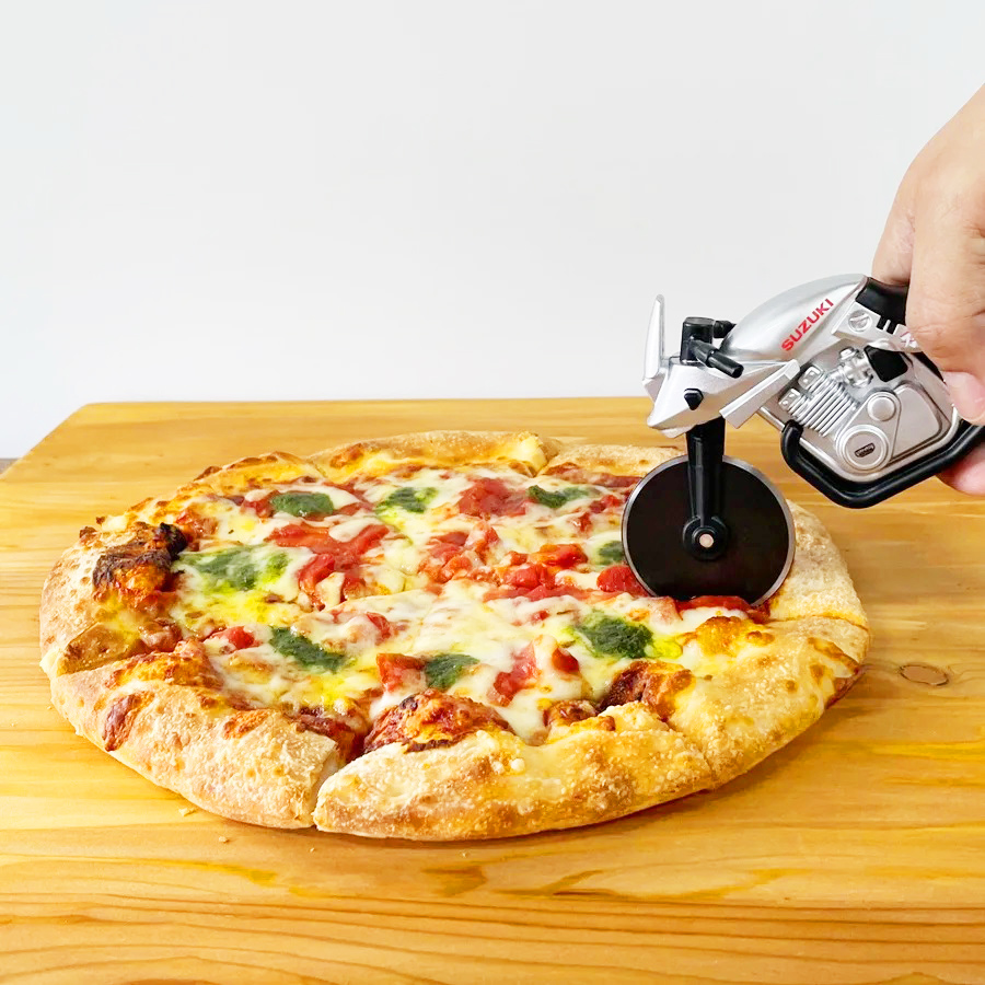 「ピザカッターナ」は、前輪部分がピザカッターとして機能するユニークなアイテム。使用後は付属の専用ホルダーにセットしてインテリアとして飾ることができ、キッチンの雰囲気を一気に引き締めてくれます。