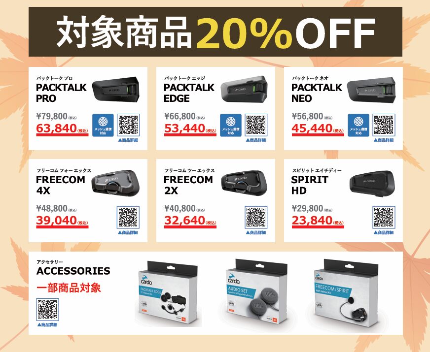 同セールの対象は、PACKTALK PROやEDGE、FREECOMシリーズなどの主要モデルおよび一部アクセサリーで、2025年8月30日から9月15日までの期間限定で定価から20%引きとなる。Cardo製品の購入を検討していたかたは、この機会を活用してみてはいかがだろうか。