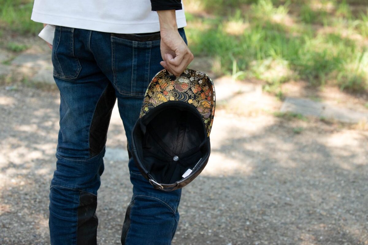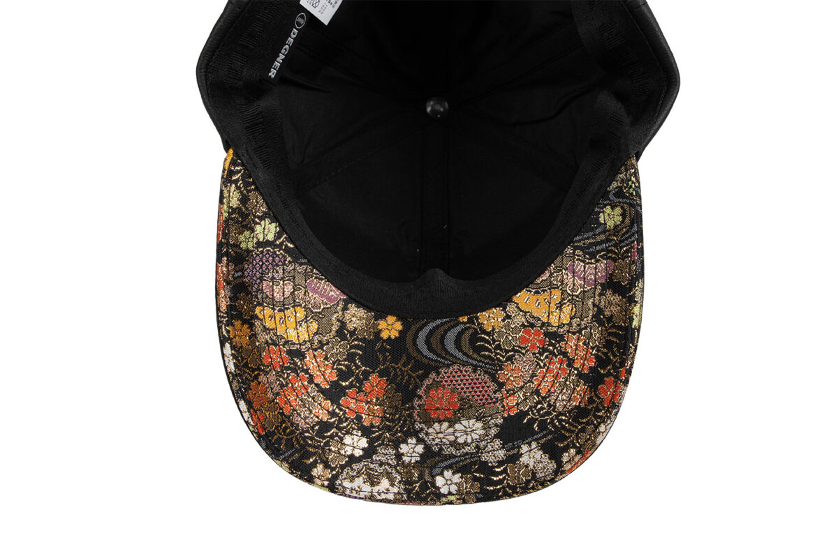 つばの内側には金襴織物を使用しており、一見シンプルなレザーキャップですが、内側にちらりと見える華やかな金襴織物が印象的。