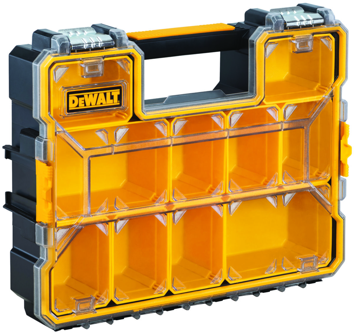 リリースされるのは、L(品番︓DWST14825)、M(品番︓DWST14830)、S(品番︓DWST14835)の3サイズ。スケルトン仕様のフタは中⾝が⼀⽬でわかる視認性に優れるほか、内部の仕切りやトレーがしっかりと固定される独⾃の設計により、収納物のサイズや形状に合わせて⾃在にレアウトすることができます。パーツや⼩物類のほか、各種電動ツールやハンドツール、アウトドア、趣味やレジャー⽤品など幅広いジャンルの整理収納に活⽤いただけます。