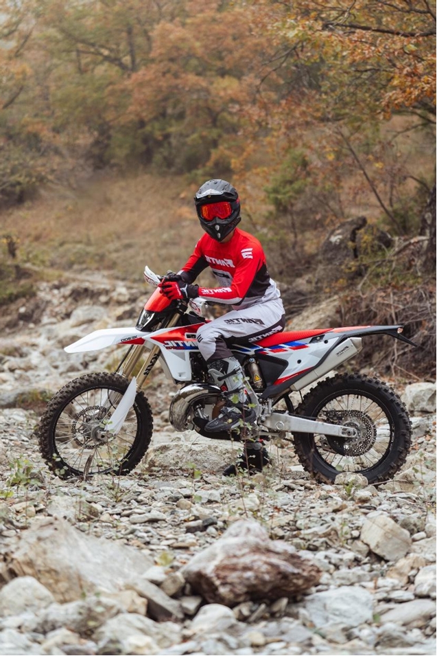 中でも唯一無二といえるのがXEF310だ。アクセル=セムが2025年のジュニア・世界チャンピオンを獲得し、その名を轟かせたこのモデルは、パワーと扱いやすさが完璧にバランスしたマシンとして、多くのファンを獲得してきた。2026年モデルでは、新しい環境規制Euro-5+に適合しながらも、エンジン/シャシーを一新。250㏄クラスの操作感を得ながらも450㏄クラスのパワーを誇るXEF310には、クラスを超えた魅力が凝縮されている。エンジンは新しいエキゾーストが用意され、Athena製のECUはハンドルバーでのセレクタブル・マップと10段階のトラクションコントロールを装備。もちろんスマートホンに提供されるアプリを使っての細やかなチューニングにも対応し、さらにスタート/キルスイッチを新しく、より転倒などの破損にも対応しやすい形状で用意した。