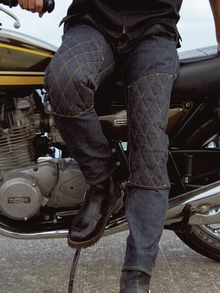 特徴的なダイヤ柄は10mm厚ウレタン+別布+デニム構造で柔軟かつ保護性能を両立しています。