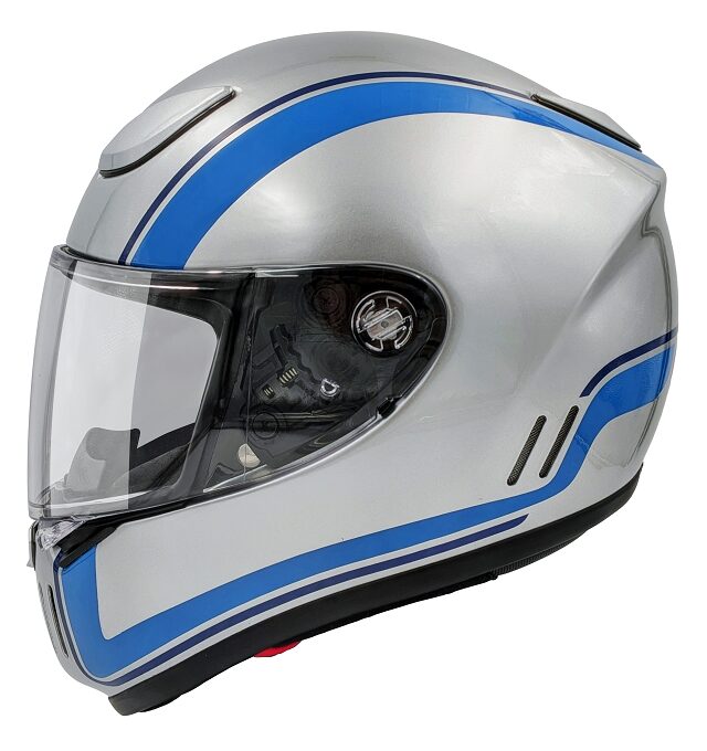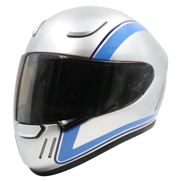 鮮やかなメタリックシルバーのボディに、2つのトーンのブルーのラインが弧を描くように配置されています。現行グラフィックモデルのデザインをモチーフに、更にシンプル且つヘルメットの造詣を引き立たせるデザインに仕上げました。国内ペイントプロショップによってひとつひとつハンドメイドで仕上げた一品です。