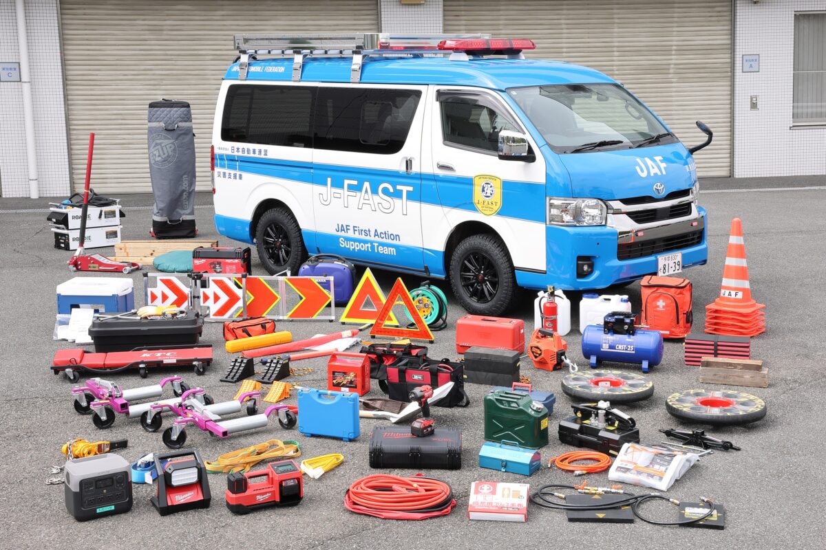 J-FAST専用の災害支援車(JAF初導入)は、通常のサービスカーにはない、災害対応資機材を搭載。主な装備は以下の通りです。
