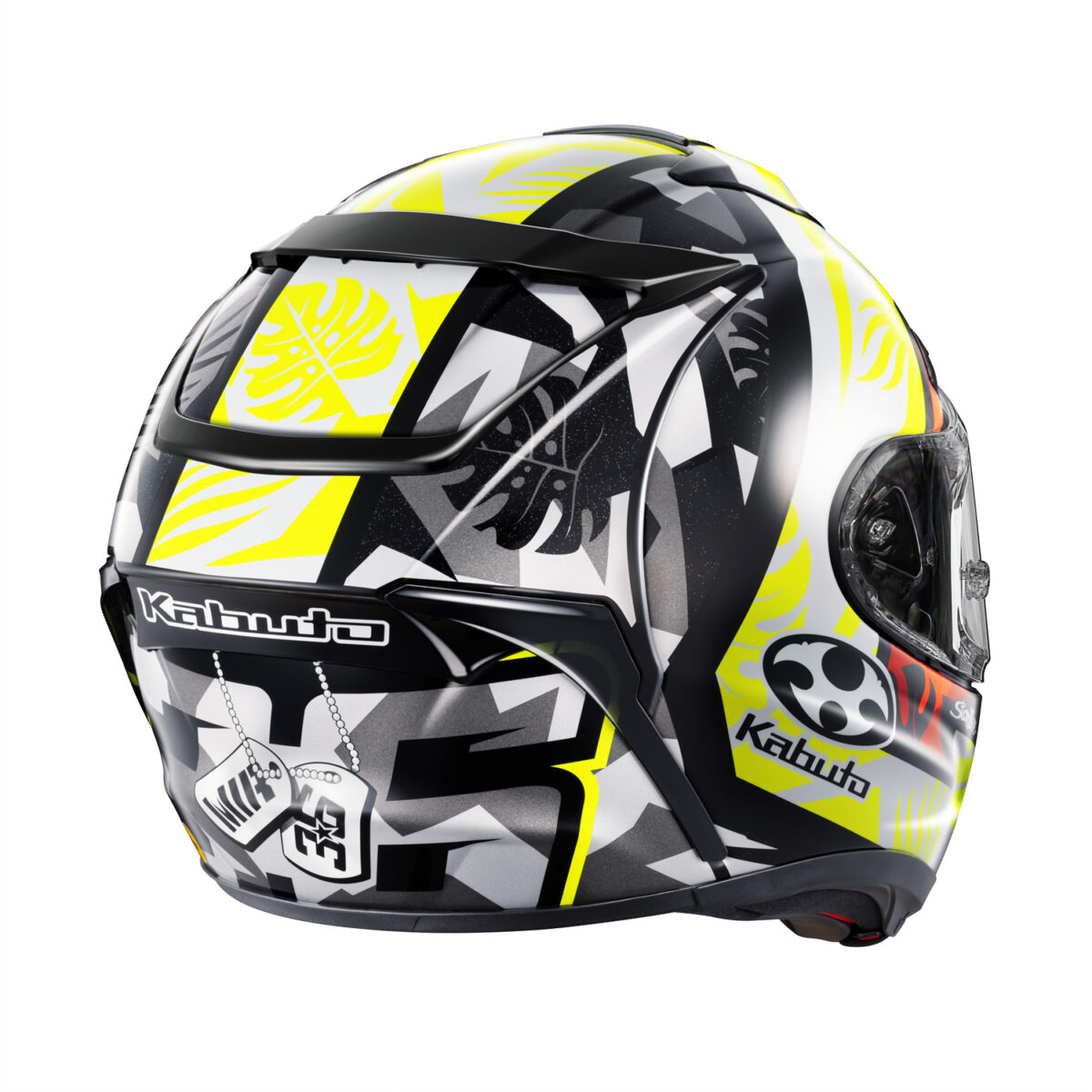 スペイン・マヨルカ島の豊かな自然をモチーフにしたデザインで、鮮やかなイエローをベースに情熱的なレッドを大胆にあしらった鮮烈なカラーリングが特徴です。ヘルメット全体には、オリーブやシュロの葉、モンステラなど南国の植物をイメージしたリーフ模様をシャドーで表現し、バレアレス海の自然美を感じさせる仕上がりに。後頭部には”MIR”の文字とレーシングナンバー「36」が刻まれたドッグタグモチーフをレイアウトし、ミル選手のパーソナルな世界観を表現しています。