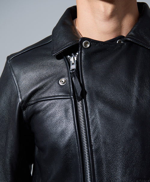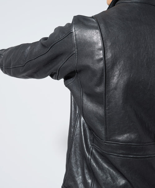 ハンティングジャケットとライダースを融合させた独自のデザインが特徴で、素材にはベジタブルタンニンなめしのシープスキンを使用。