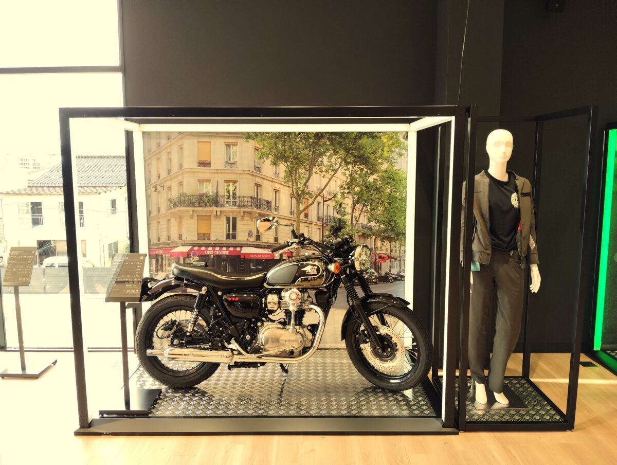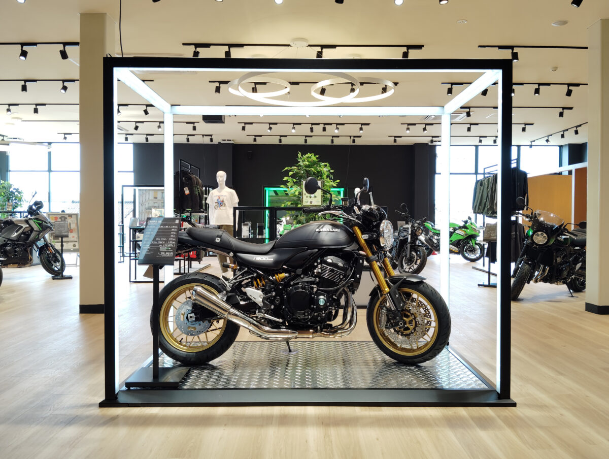 新たなオーナーを待つモーターサイクルたちが、ケージの中で静かに眠りについているイメージを光の枠で創出。カワサキプラザならではのアイコニックポイントの一つです。