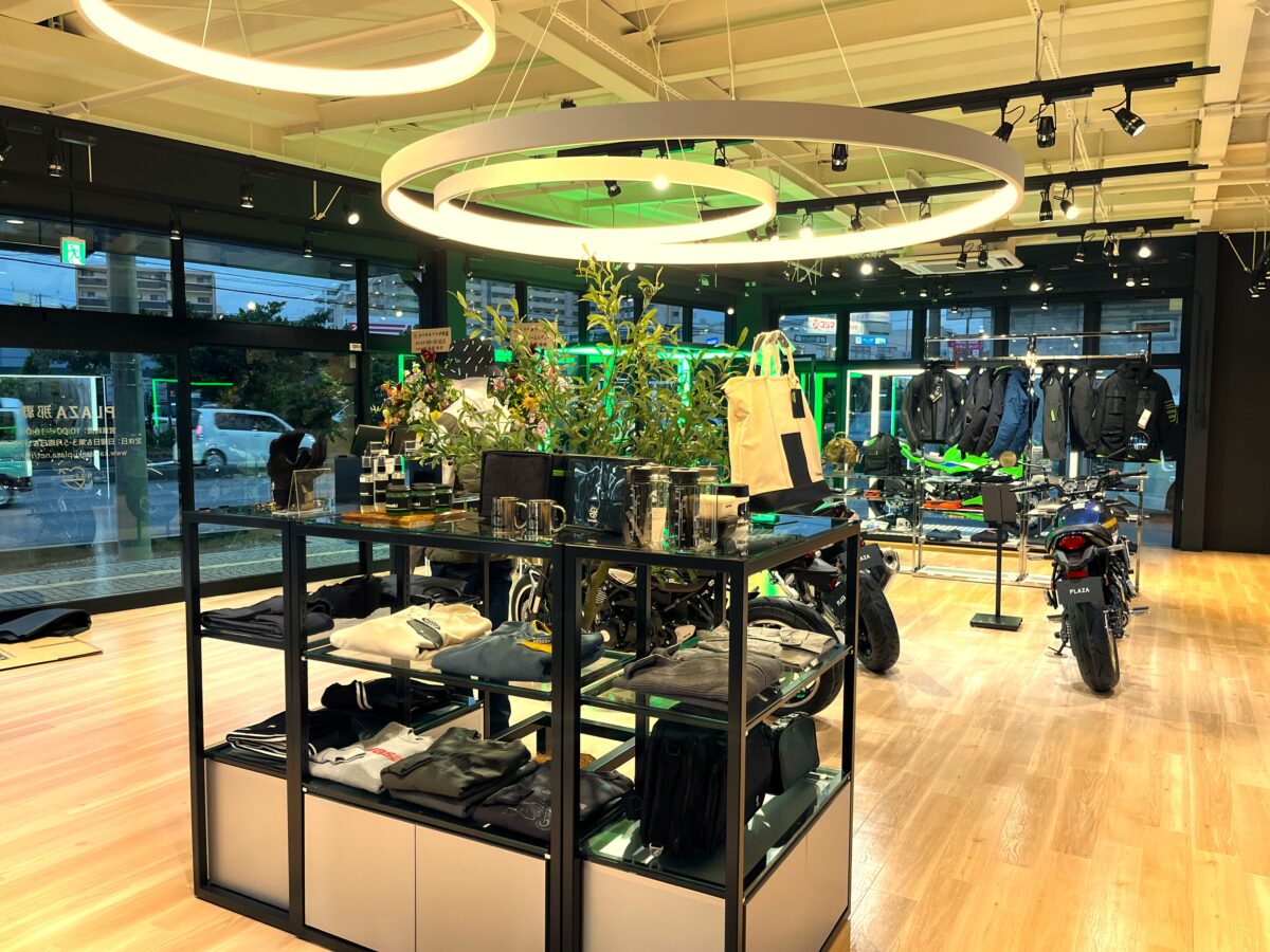 木目調のフロアと白い天井が織りなす明るい店内。モーターサイクルとプラザアパレルがゆったりと展示され、どなたでも楽しめる空間となっています。