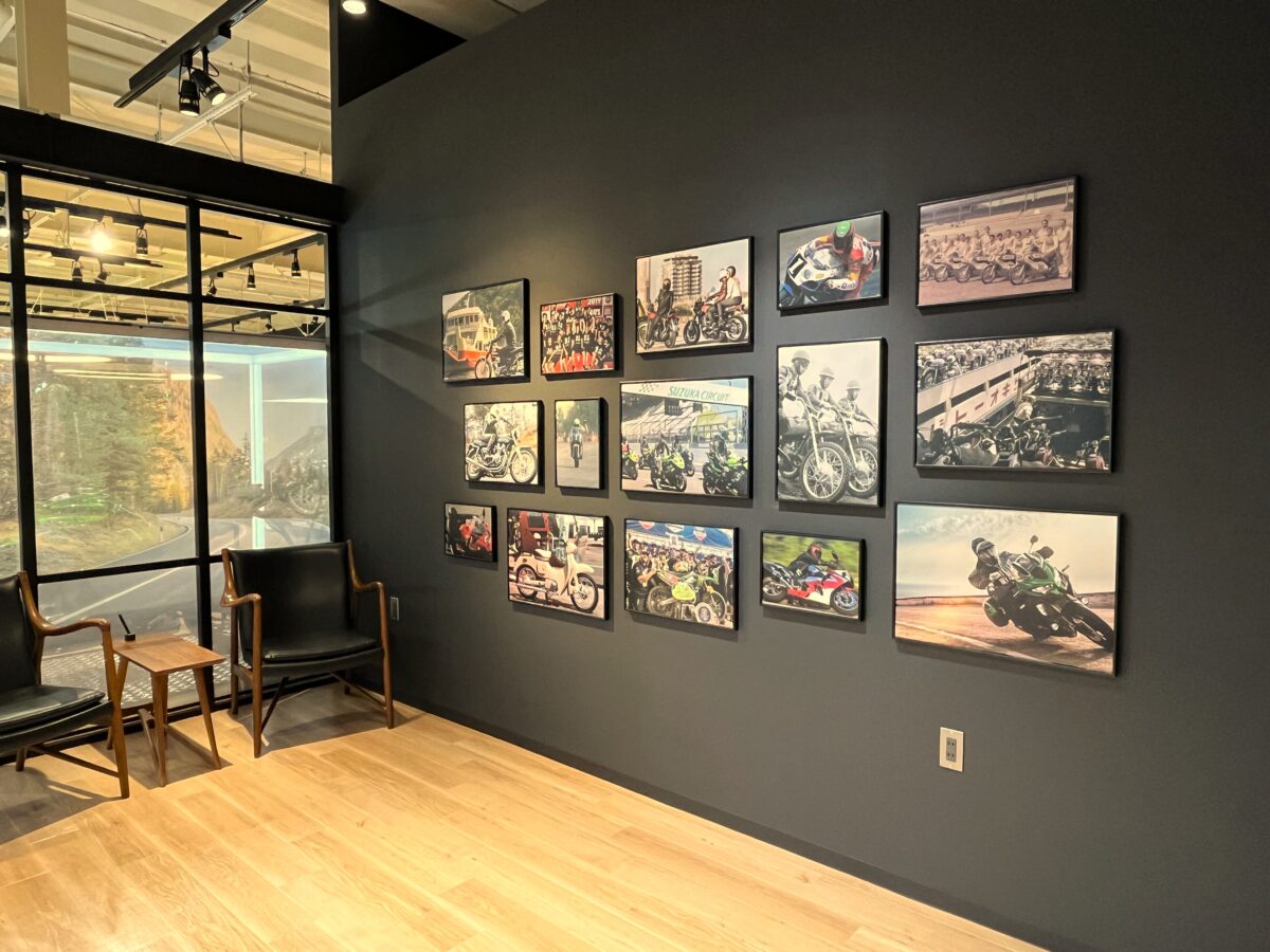 新たなオーナーを待つモーターサイクルたちが、ケージの中で静かに眠りについているイメージを光の枠で創出。カワサキプラザならではのアイコニックポイントの一つです。