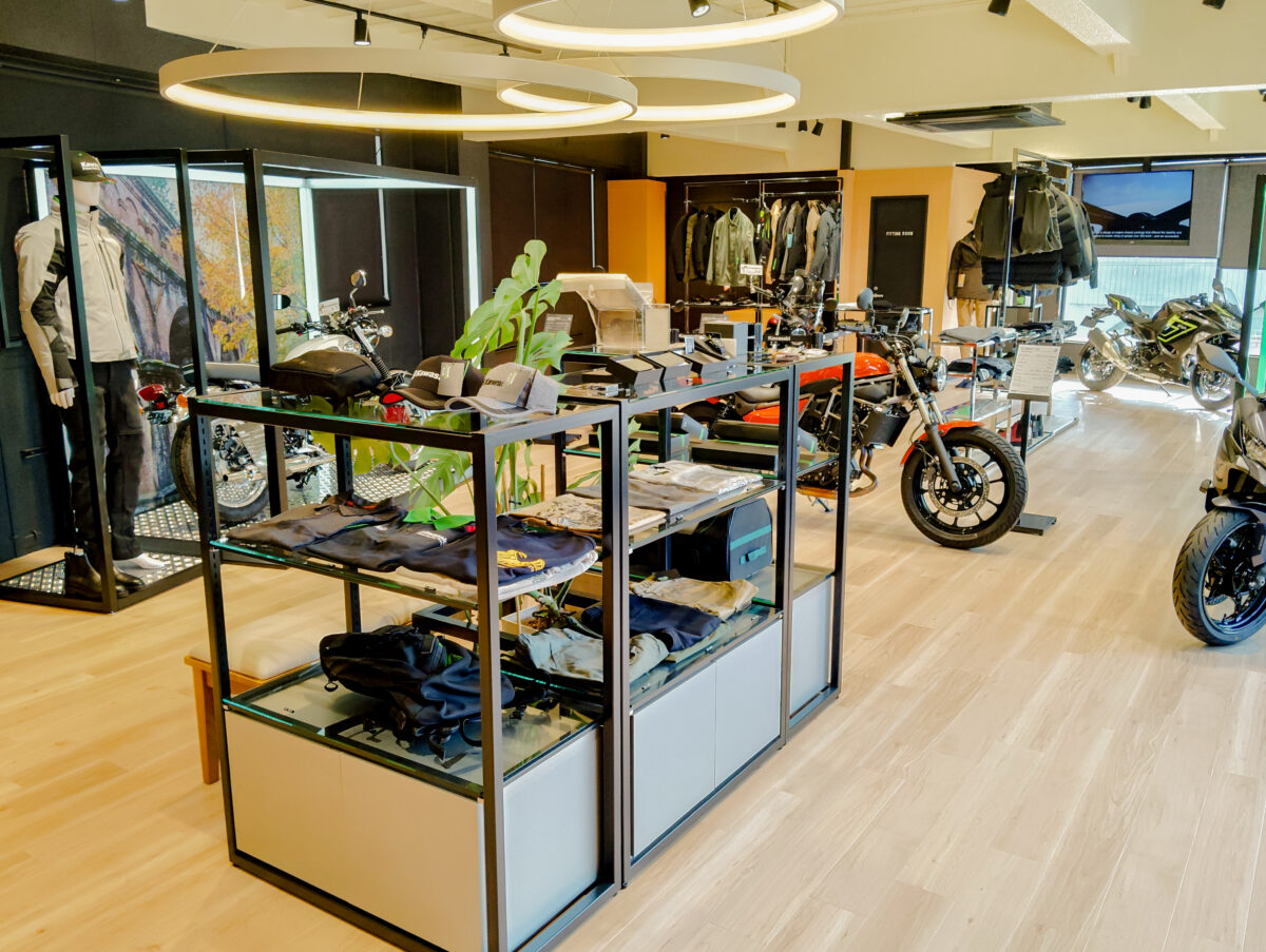 木目調のフロアと白い天井が織りなす明るい店内。モーターサイクルとプラザアパレルがゆったりと展示され、どなたでも楽しめる空間となっています。