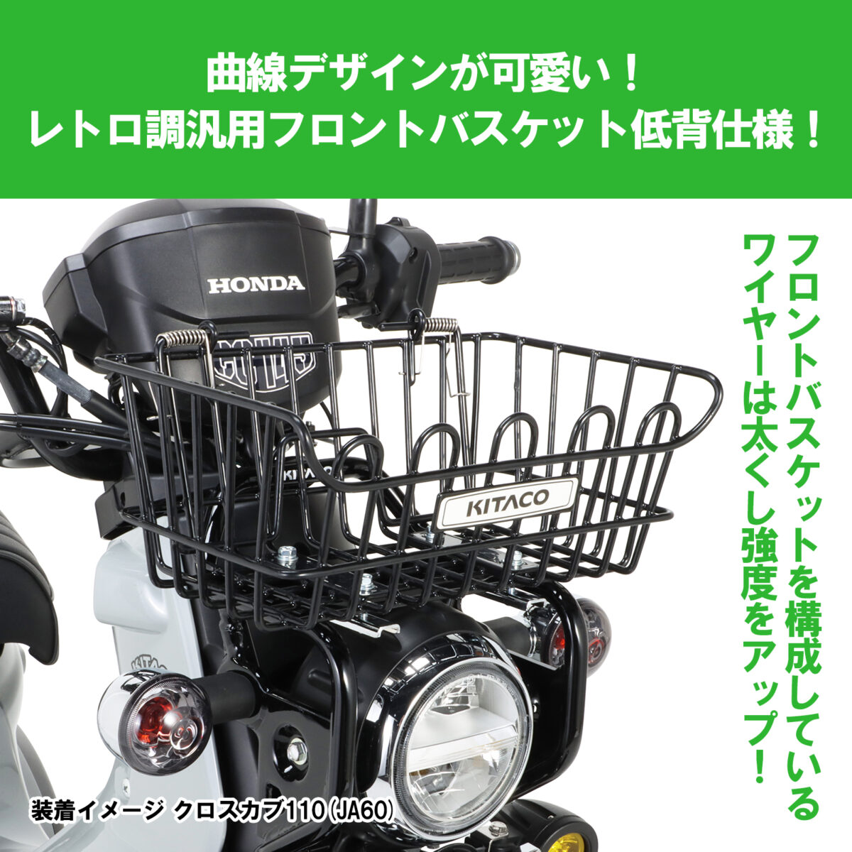 株式会社キタコは、ホンダ「クロスカブ50(AA06)」および「クロスカブ110(JA45/JA60)」に対応する低背仕様のレトロ調フロントバスケットを新たに発売した。