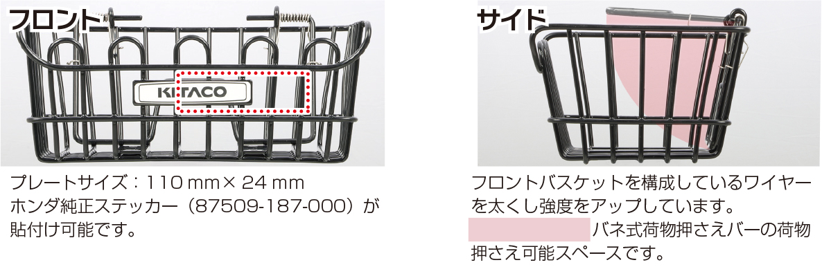 クロスカブ50(AA06)/クロスカブ110(JA45/JA60)にも対応するように低背仕様のフロントバスケットがラインナップ。
