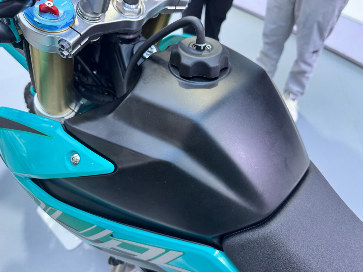 HC700高強度鋼材を使用したダブルクレードルフレーム+アルミサブフレームで車両重量120kg。シート高は未定だが、開発中のモデルにまたがったところ、身長170cm・体重75kgのライダーで両足つま先立ちレベル。タンク容量は9.5Lでモトクロッサー MX450の6.5Lよりも増量 - サスペンション