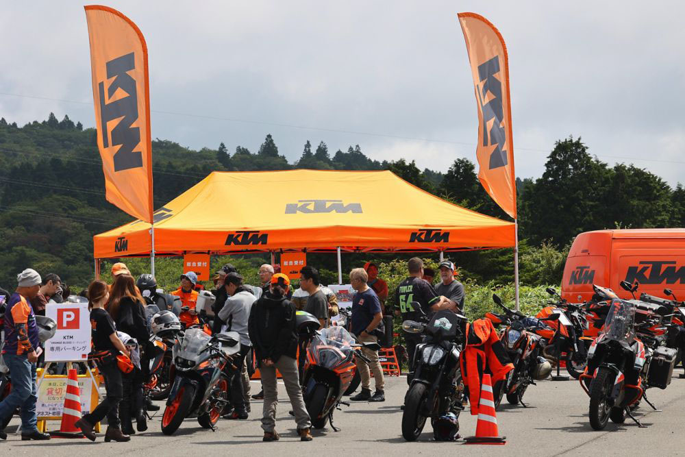 ミーティング会場の目印は、KTMのオレンジテントです。あじさいフローラみきの第二駐車場をミーティング専用エリアとしてお借りしていますので、現場ではスタッフの誘導指示に従ってください。
